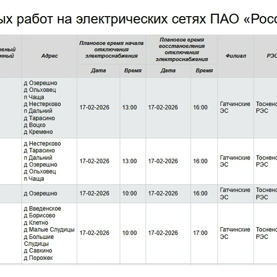 У ПАО "Россети Ленэнерго" запланированы работы на вторник, 17 февраля 2026.