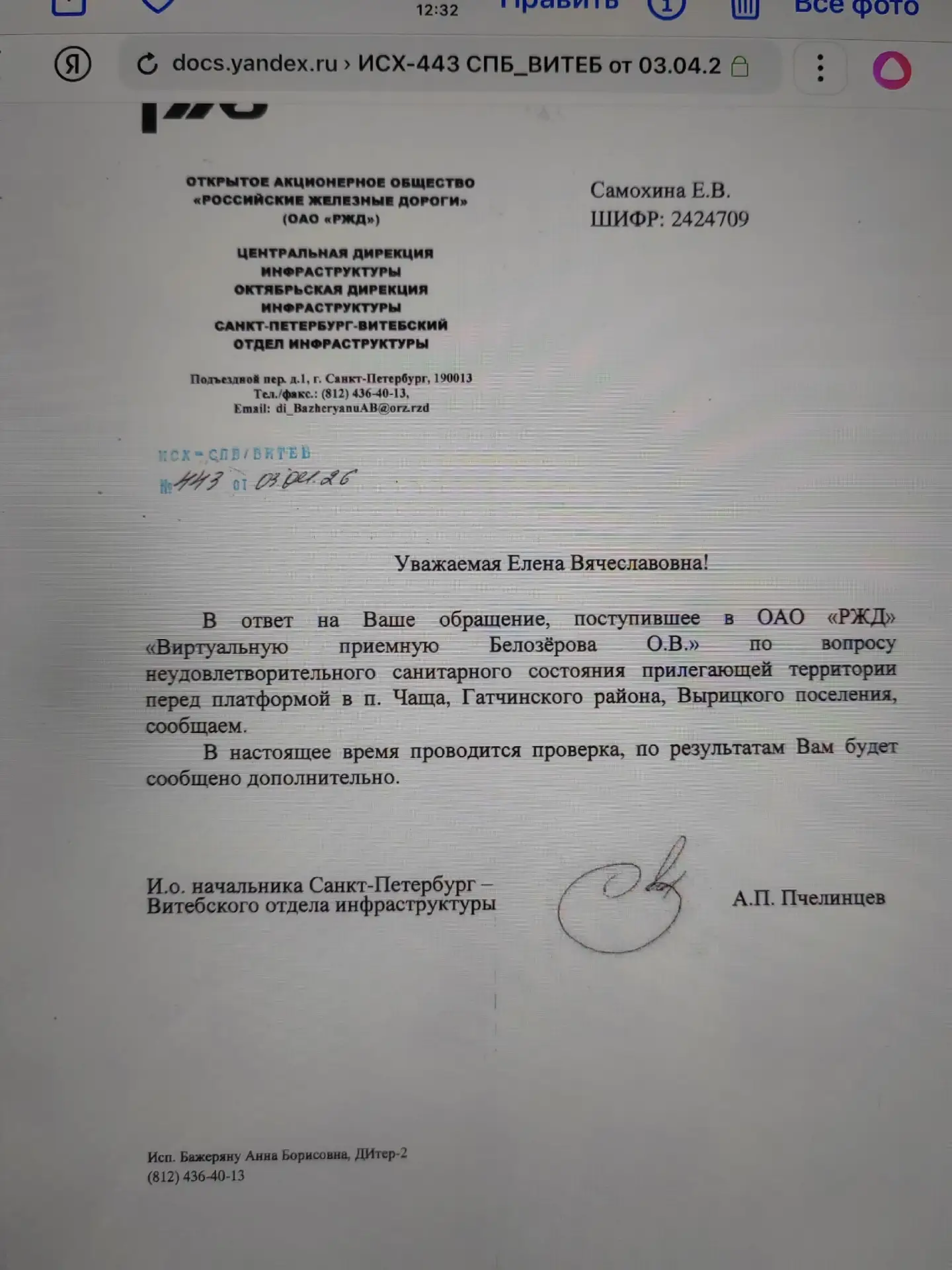 Скоро в нашу Чащу приедет проверка от РЖД, после моей жалобы одному из руководителей РЖД, о неудовлетворительном состоянии дороги у платформы п. Чаща, и мне пришел вот такой ответ.