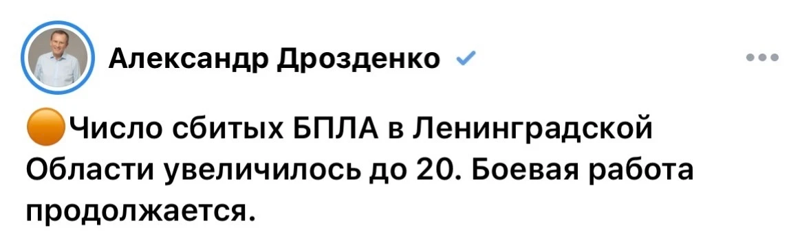 Около 4 утра в ЛО объявлена воздушная опасность. А на данный момент, по сообщению губернатора атака продолжается и сбито уже 20 б/п.