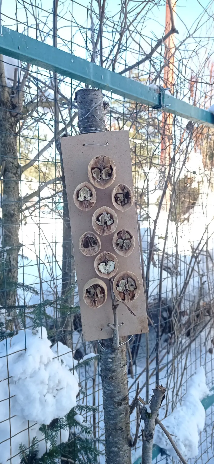К новому лакомству, грецким орехам, прилетала синичка-лазоревка, сфоткать ее не успела, так как слишком долго любовалась на нее.)