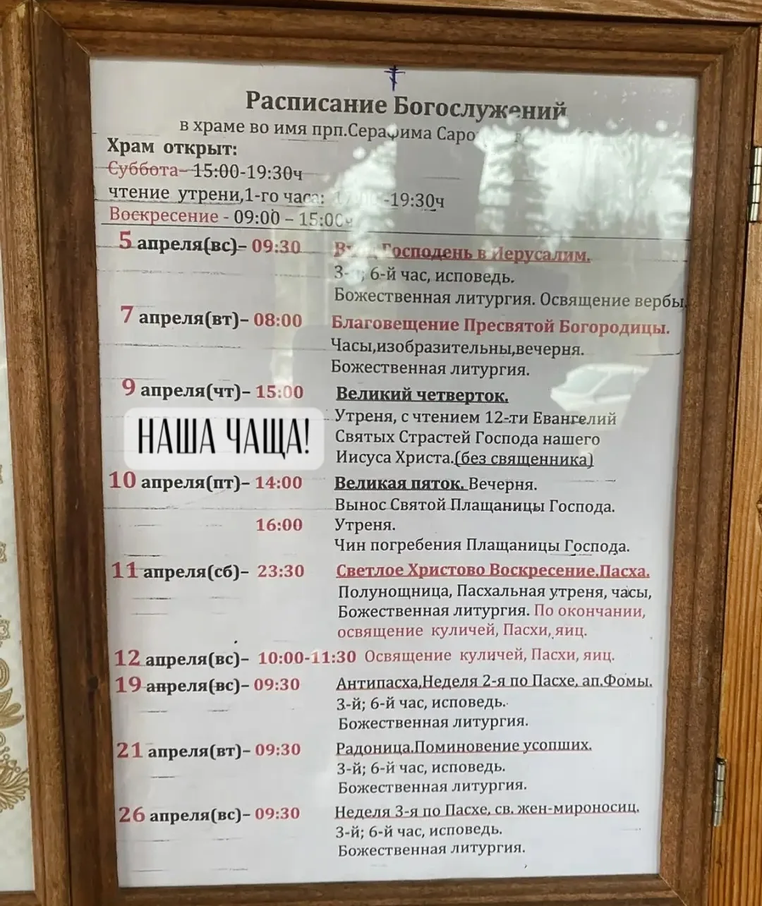С Вербным воскресеньем! А это расписание Богослужений в нашем храме Серафима Саровского в посёлке Чаща.