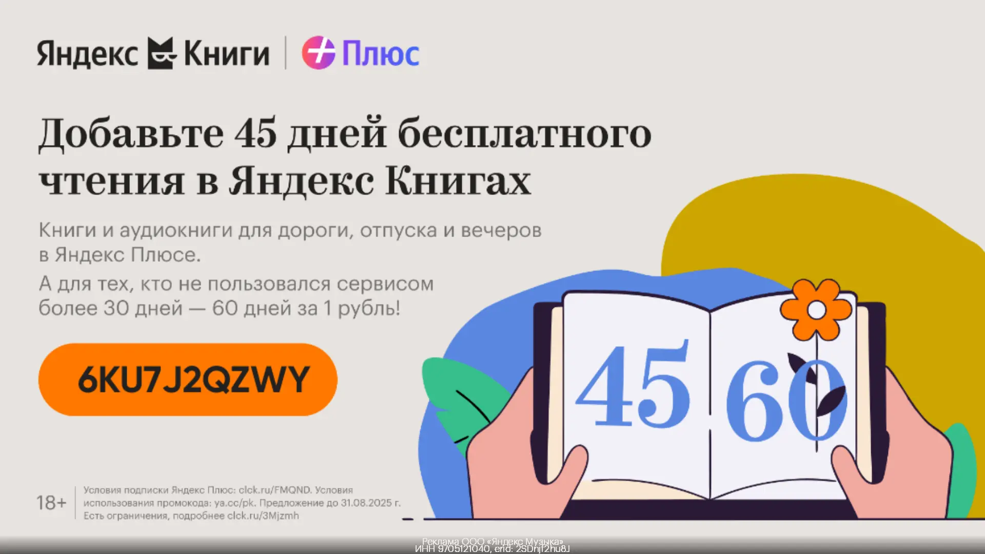 Читайте и слушайте новинки, бестселлеры, детективы, фэнтези и нон-фикшн в Яндекс Книгах. Также в подписку Плюса входит: Кинопоиск, Яндекс Музыка, и море выгоды в сервисах Яндекса