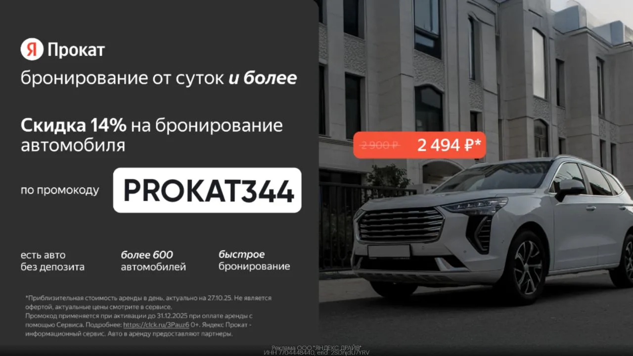 🔥 Скидка 14% для всех пользователей на бронирование автомобиля через Яндекс Прокат