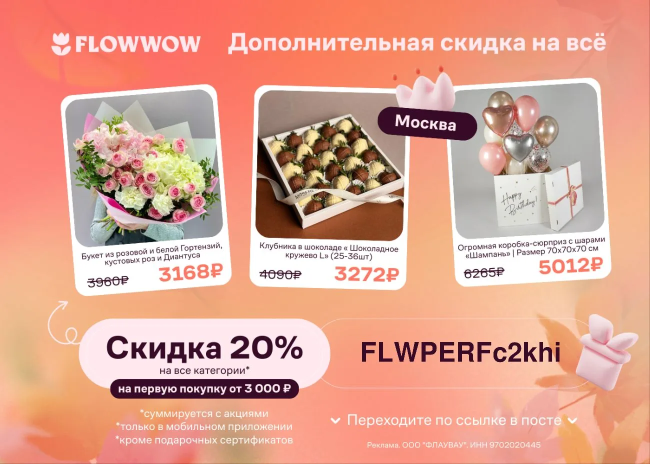 По промокоду FLWPERFc2khi действует скидка 20% на все категории! Это могут быть любые товары маркетплейса: авторские букеты, торты с вашим дизайном, декор и многое другое.