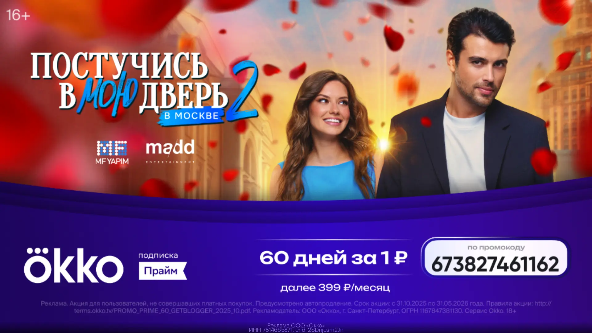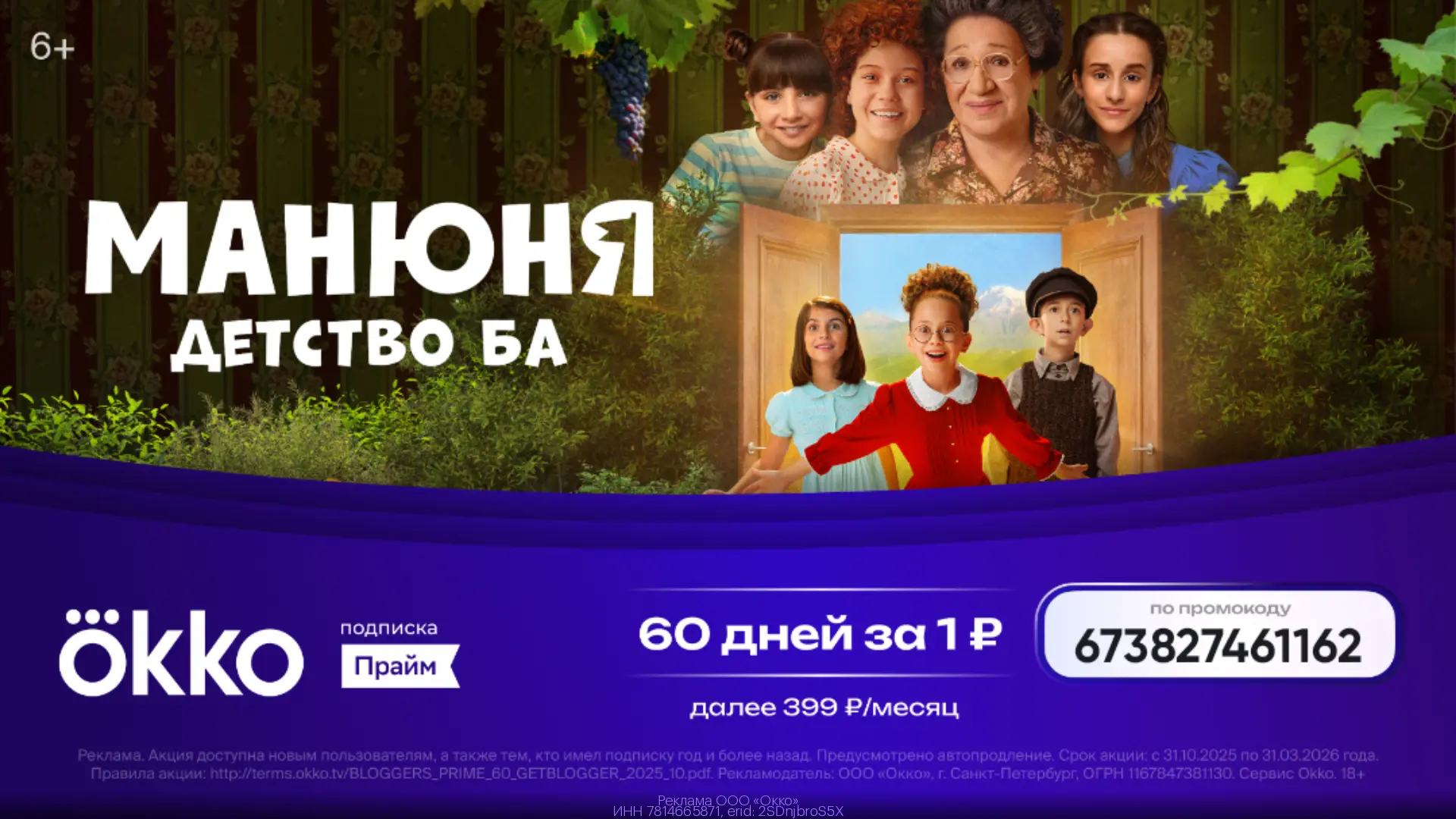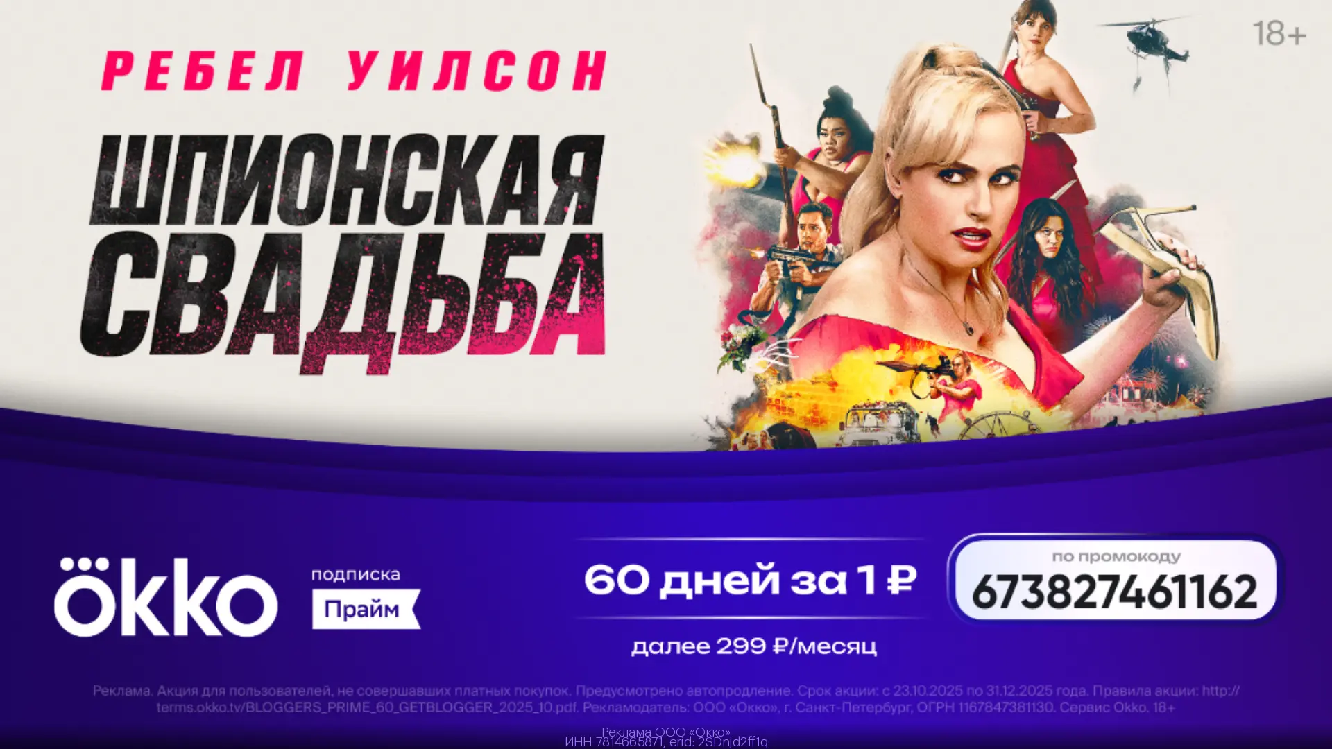 Регистрируйся в Okko 👈 используй промокод 673827461162 получи 60 дней подписки «Прайм» за 1₽, далее 299 ₽ в месяц