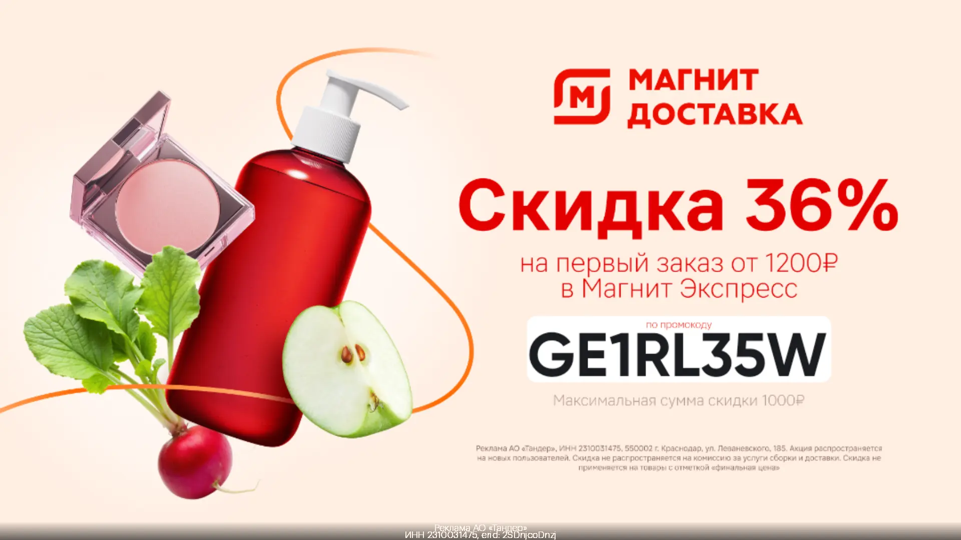 🔻Скидка 36% на первый заказ от 1 200 ₽ в Магнит Экспресс 👉 по промокоду GE1RL35W