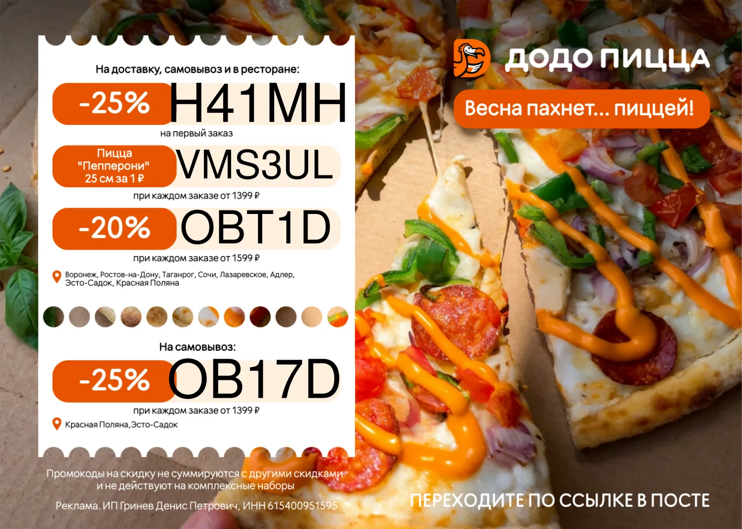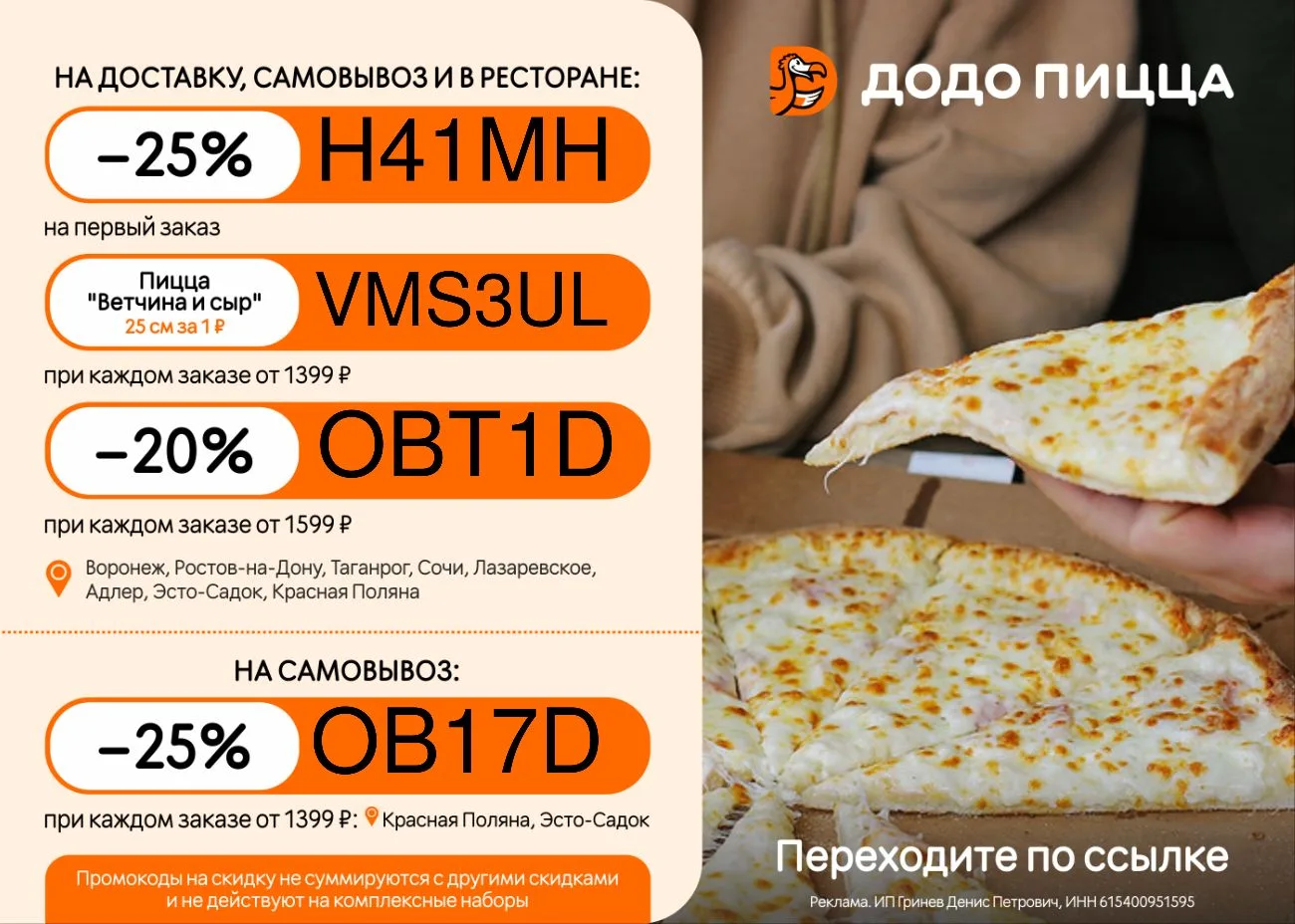 🍕 OB17D – Скидка 25% при каждом заказе от 1399 ₽ (Красная Поляна, Эсто-Садок) на самовывоз