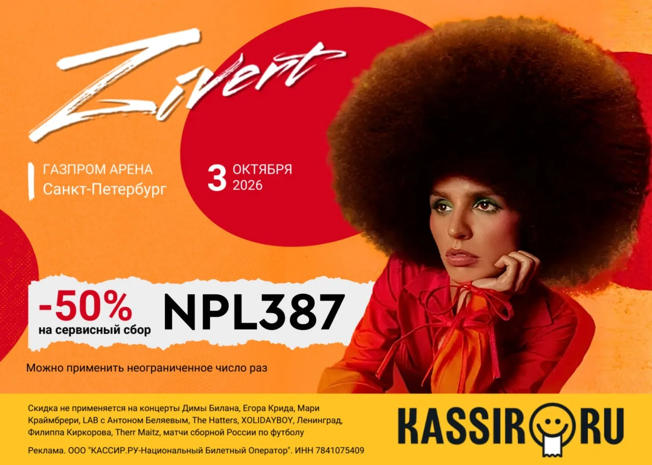 *Скидка не применяется на концерты Димы Билана, Егора Крида, Мари Краймбрери, LAB с Антоном Беляевым, The Hatters, XOLIDAYBOY, Ленинград, Филиппа Киркорова, Therr Maitz, матчи сборной России по футболу