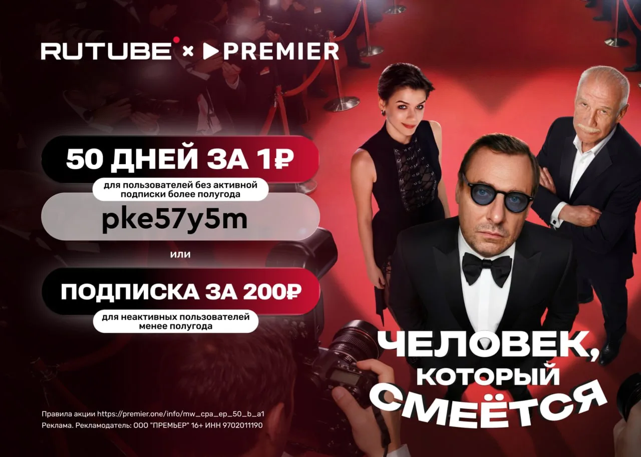 Переходите по ссылке 👈 вводите промокод pke57y5m , который дает 50 дней доступа к сервисам RUTUBE + PREMIER за 1 ₽ для пользователей без активной подписки более полугода или подписка на один месяц за 200 ₽ для неактивных пользователей менее полугода, далее – 399 ₽.