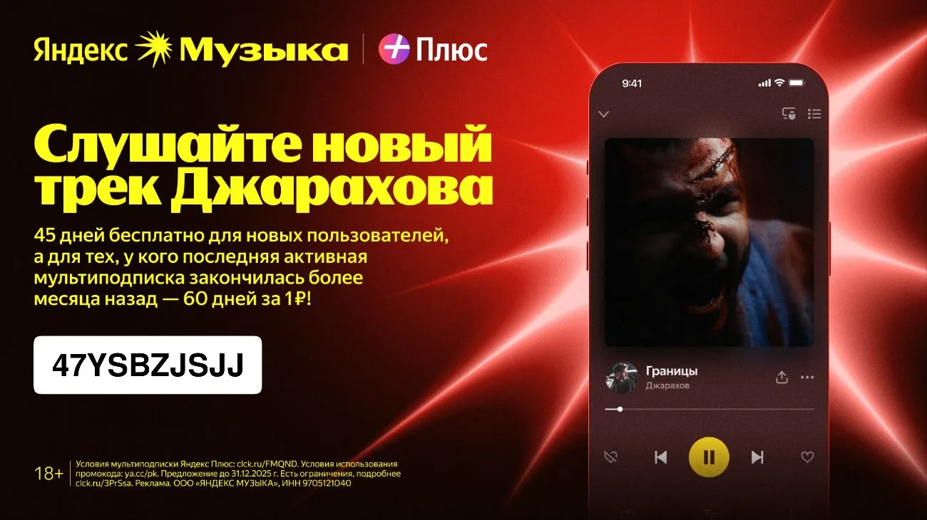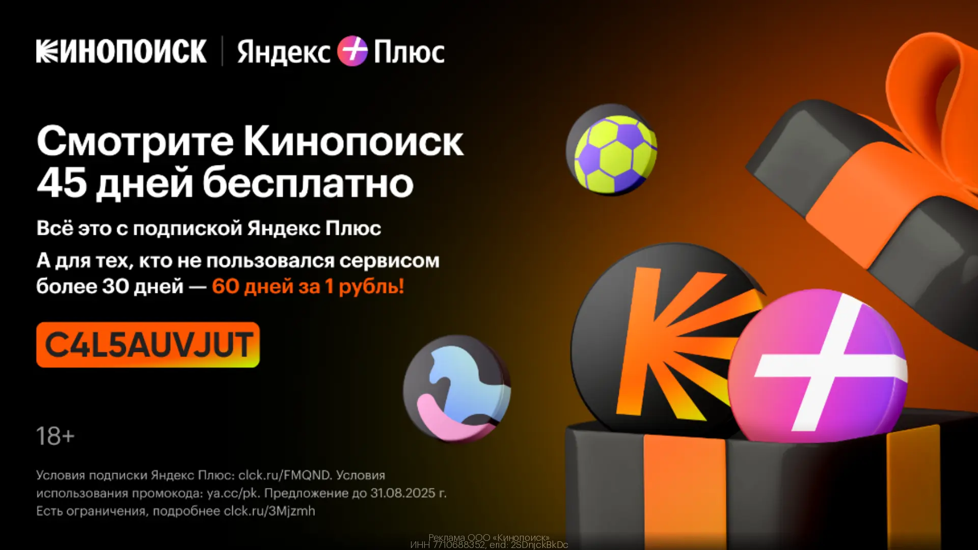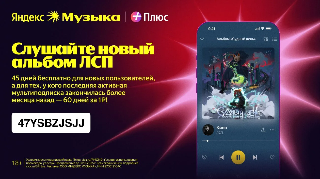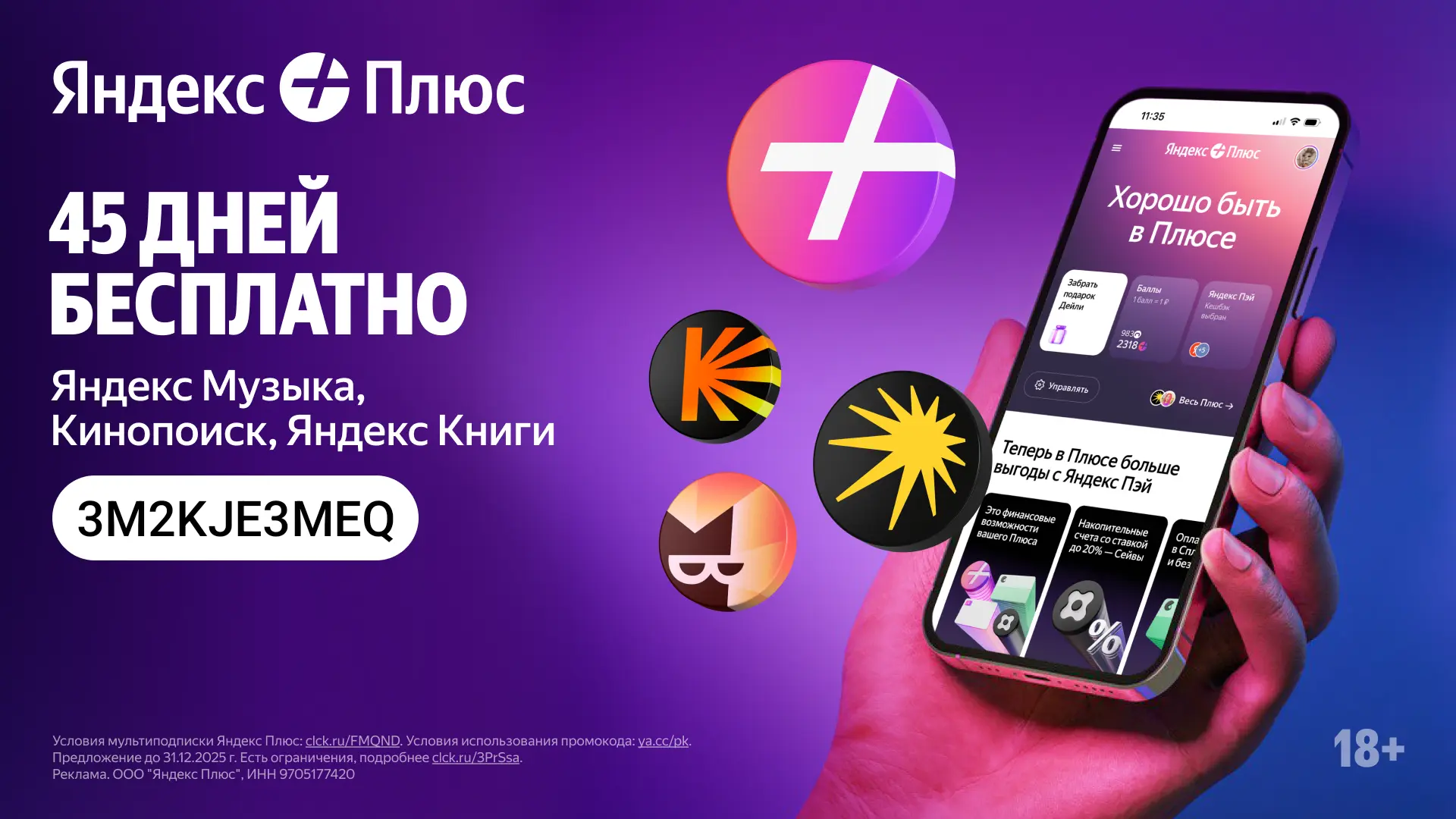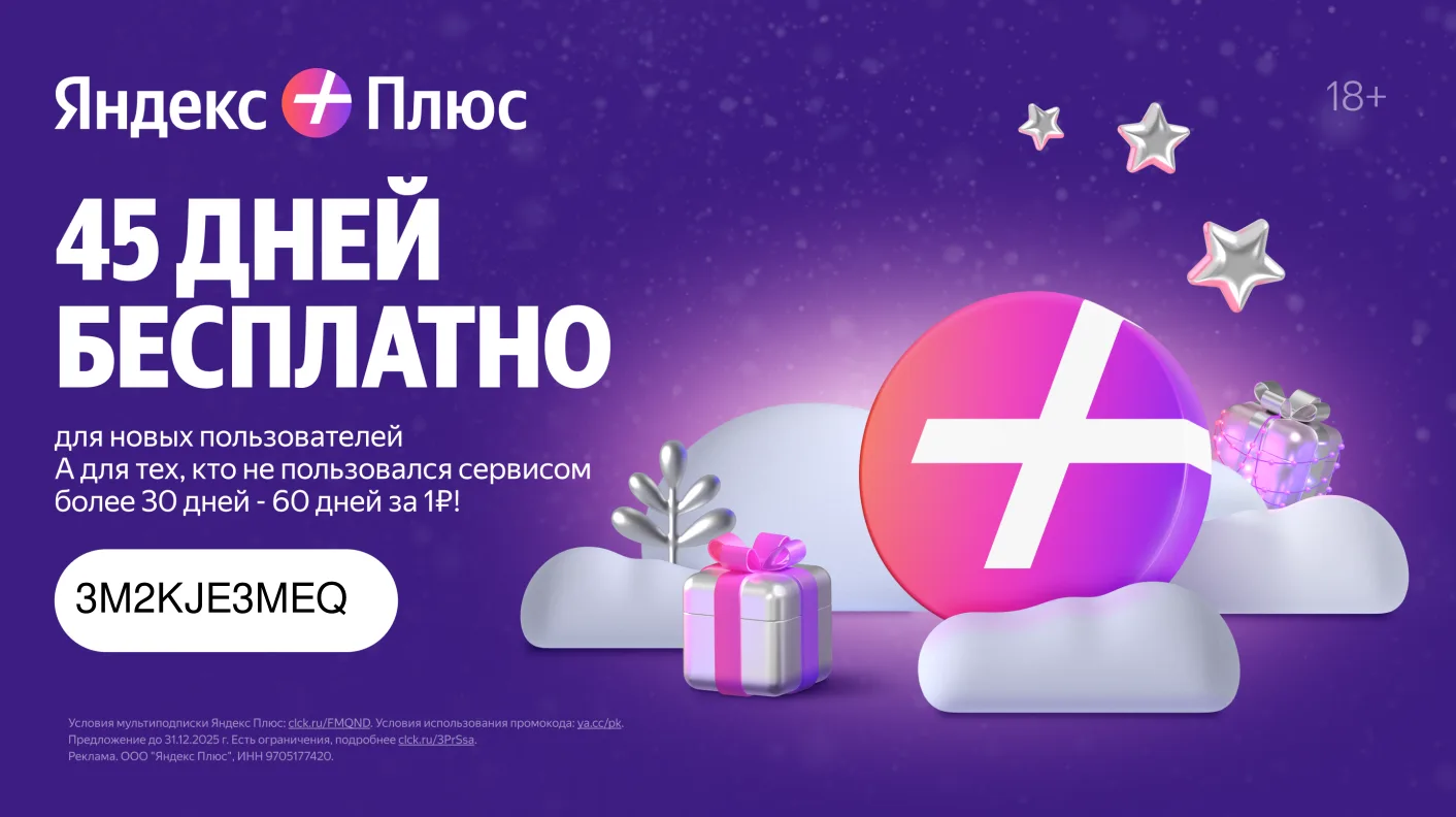 Переходите по ссылке 👈 Подключайте Яндекс Плюс - 6KU7J2QZWY 45 дней бесплатно для новых пользователей! 60 дней за 1₽, если вы уже пользовались подпиской и она закончилась более 30 дней назад