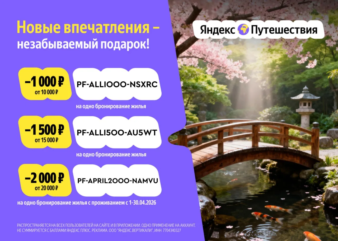 ❇️ PF-APRIL2OOO-NAMVU — скидка 2 000 ₽ от 20 000 ₽ на одно бронирование отеля (на бронирования с выездом до 30.04.26).