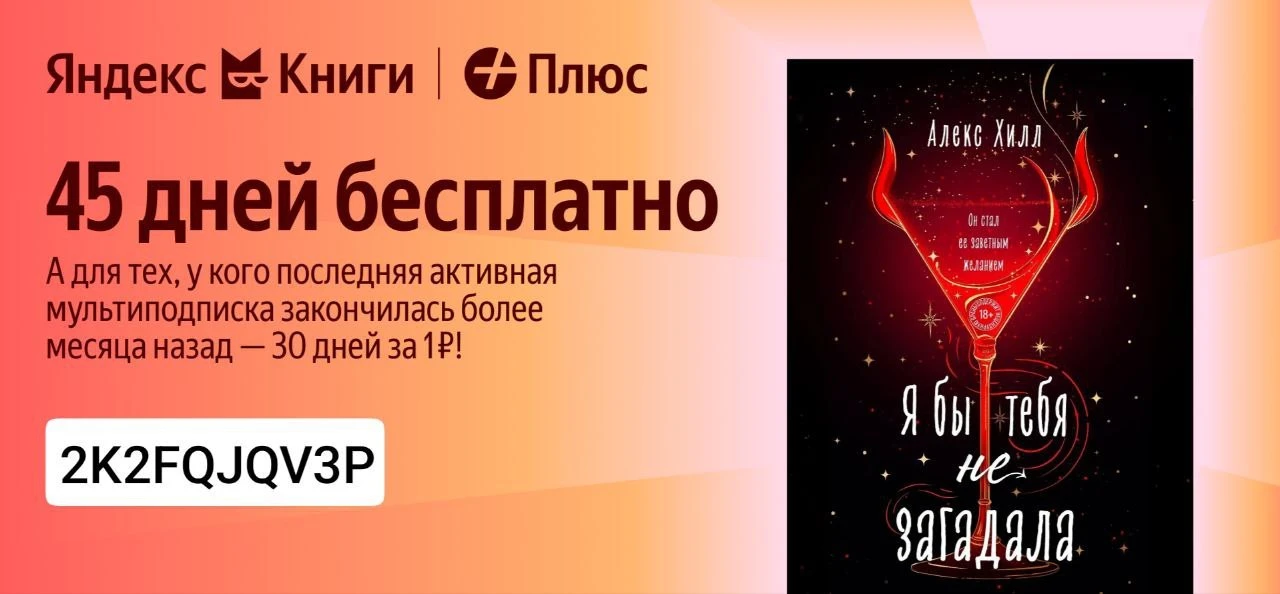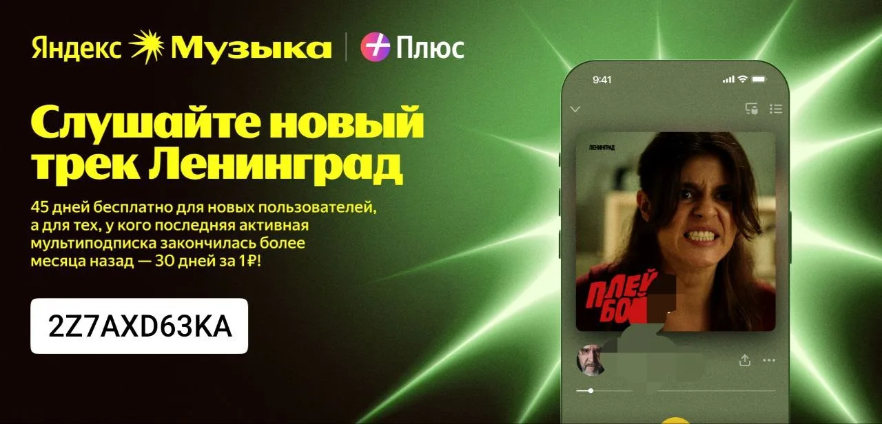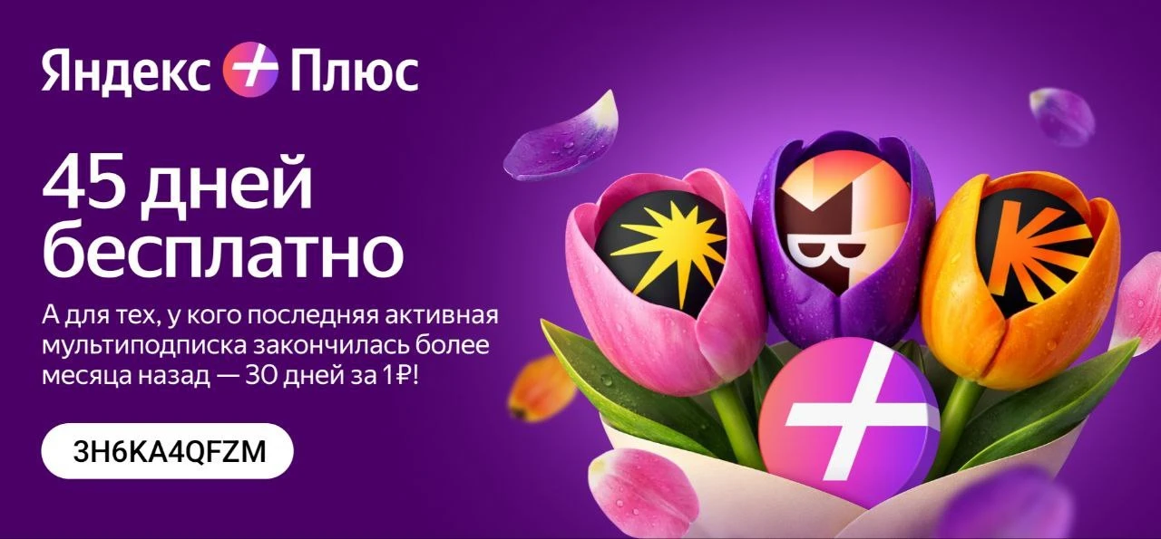 Переходите по ссылке 👈 и получите бесплатный доступ на 45 дней для новых пользователей по промокоду 2Z7AXD63KA и 30 дней за 1 ₽ для тех, у кого мультиподписка Яндекс Плюс закончилась более месяца назад и не использовалась услуга реактивации.