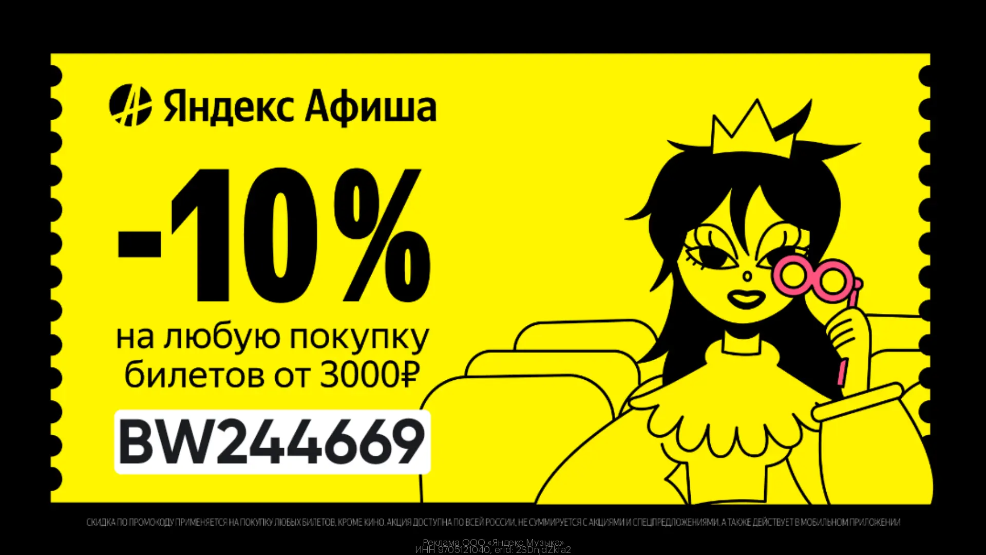 Действует в мобильном приложение или на сайте Яндекс Афиша. Применяется на покупку любых билетов, КРОМЕ подарочных сертификатов, билетов в кино и при оплате Пушкинской картой