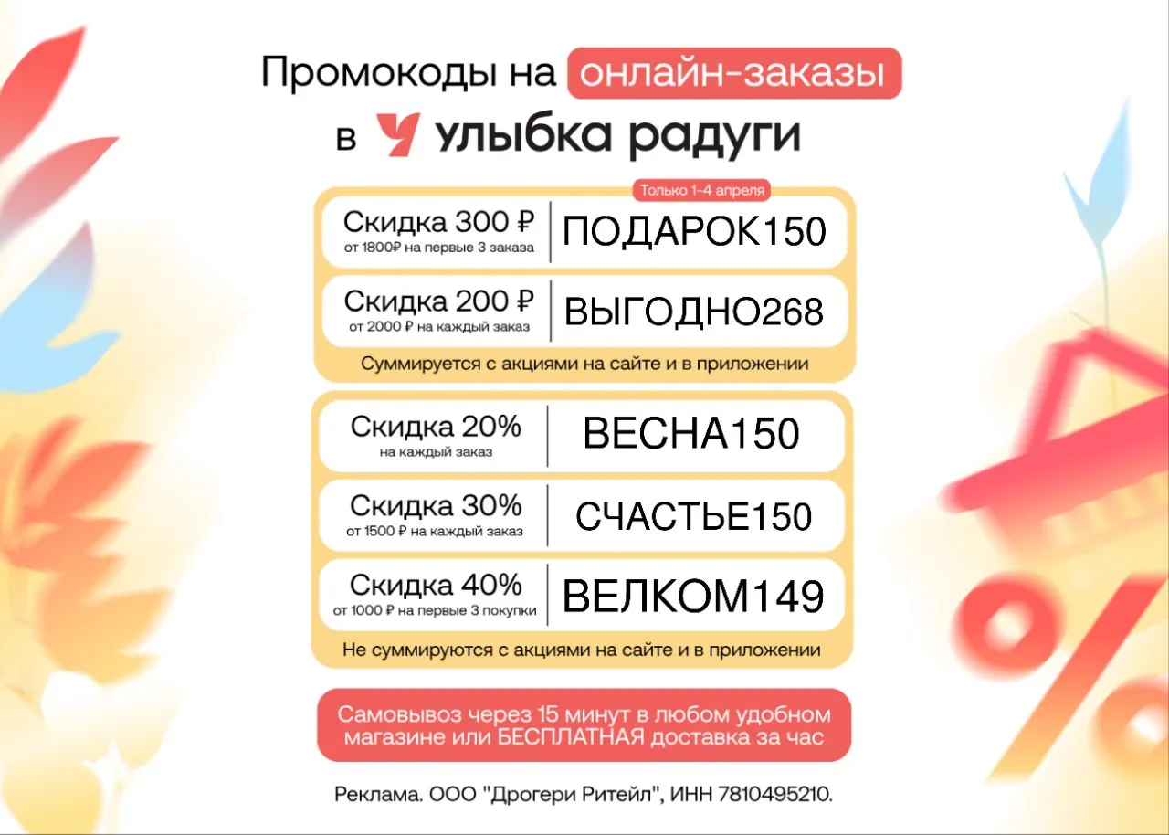 Промокоды суммируются со скидками, не действуют в магазинах «Самокат», «Чижик», «Пятерочка» и «Перекресток», заблокирован и в ресторанах. При нарушении правил сервиса аккаунт может быть заблокирован.