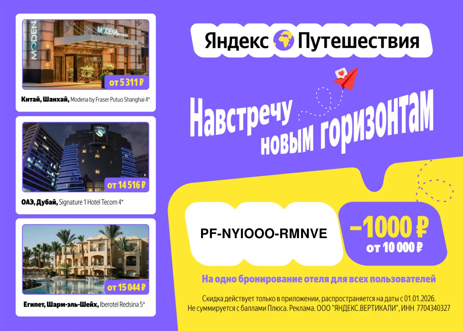 💛 PF-NYIOOO-RMNVE — скидка 1 000 ₽ от 10 000 ₽ на одно бронирование отеля.