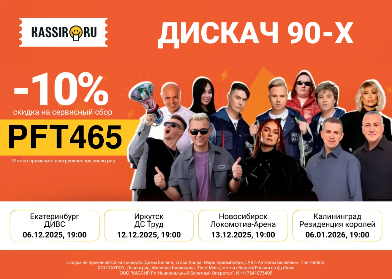 Скидка не применяется на концерты Димы Билана, Егора Крида, Мари Краймбрери, LAB с Антоном Беляевым, The Hatters, XOLIDAYBOY, Ленинград, Филиппа Киркорова, Therr Maitz, матчи сборной России по футболу