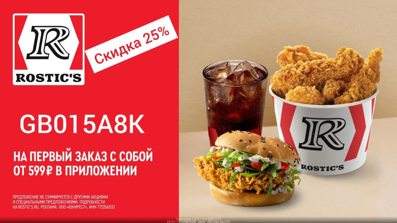 🍔 GB015A8K - скидка 25% от 599₽ на первый заказ на самовывоз в приложении ROSTIC'S 👈