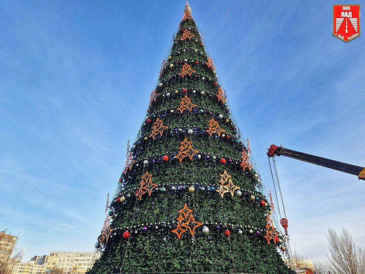 На городской ёлке размещены 224 оранжевые звезды — каждая с собственным номером и точным местом крепления. Украшения расположены по заранее рассчитанной схеме.