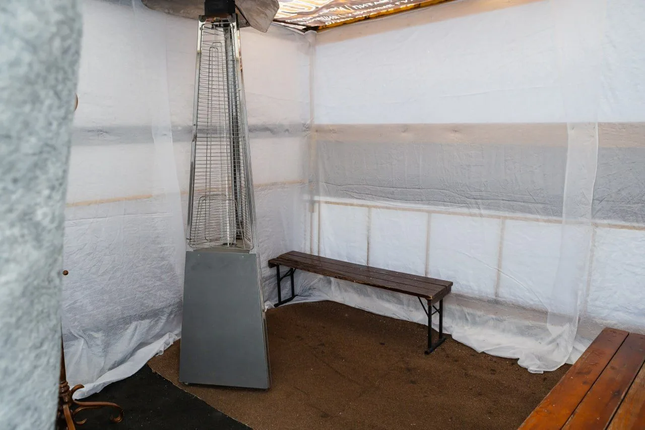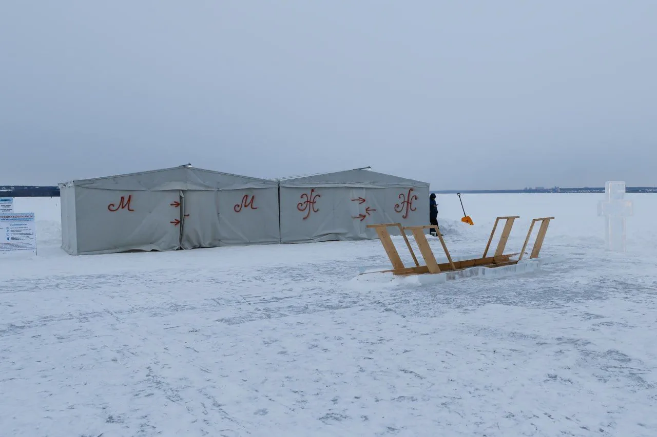 На каждой точке есть теплые палатки, чтобы переодеться и согреться. Подходы к воде выложили соломой. Спуски оборудовали деревянными лестницами.