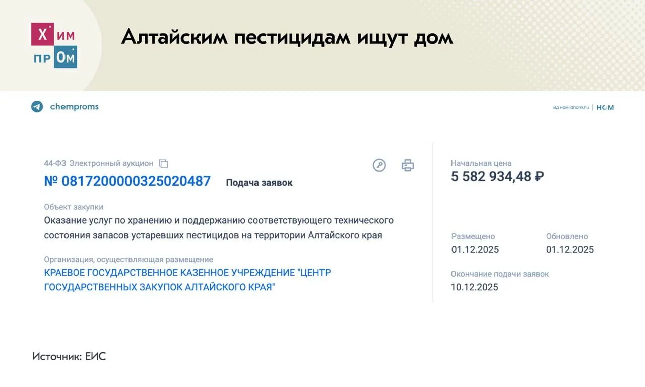 Минприроды Алтайского края ищет подрядчика, который будет хранить и поддерживать соответствующее техническое состояние запасов устаревших пестицидов. Заявка на проведение аукциона появилась на портале госзакупок в начале декабря.