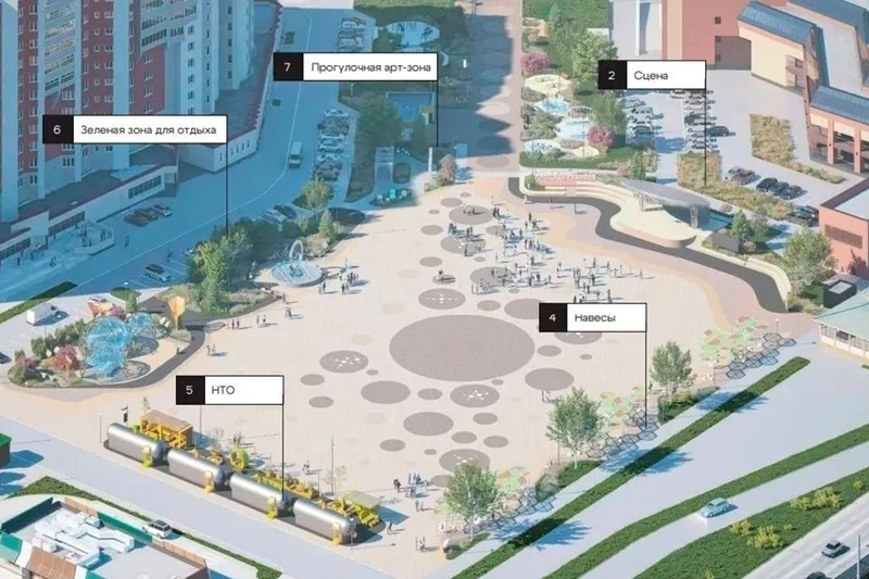 На площади установят сцену с амфитеатром, будет зона отдыха с перголами и навесами, фонтан, вокруг которого разобьют небольшой сквер. Еще появятся игровой и спортивный комплексы, точки питания, санузел. Пространство будет доступно для людей с инвалидностью.