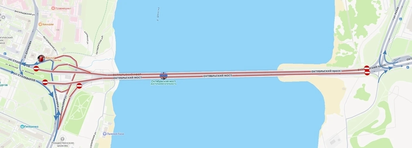 «Сегодня с 23:59 и до 5 часов утра 28 марта проезд по Октябрьскому мосту перекрыт. Ограничения коснутся и перекрестка Октябрьского проспекта и улицы Раахе, перекрестка улицы Сталеваров с улицей Данилова и перекрестка Парковой и Мамлеева. Общественный транспорт будет работать без изменений, автобусы будут пропускать по мосту. Подробная схема перекрытий — во вложении», — сообщает мэрия Череповца.