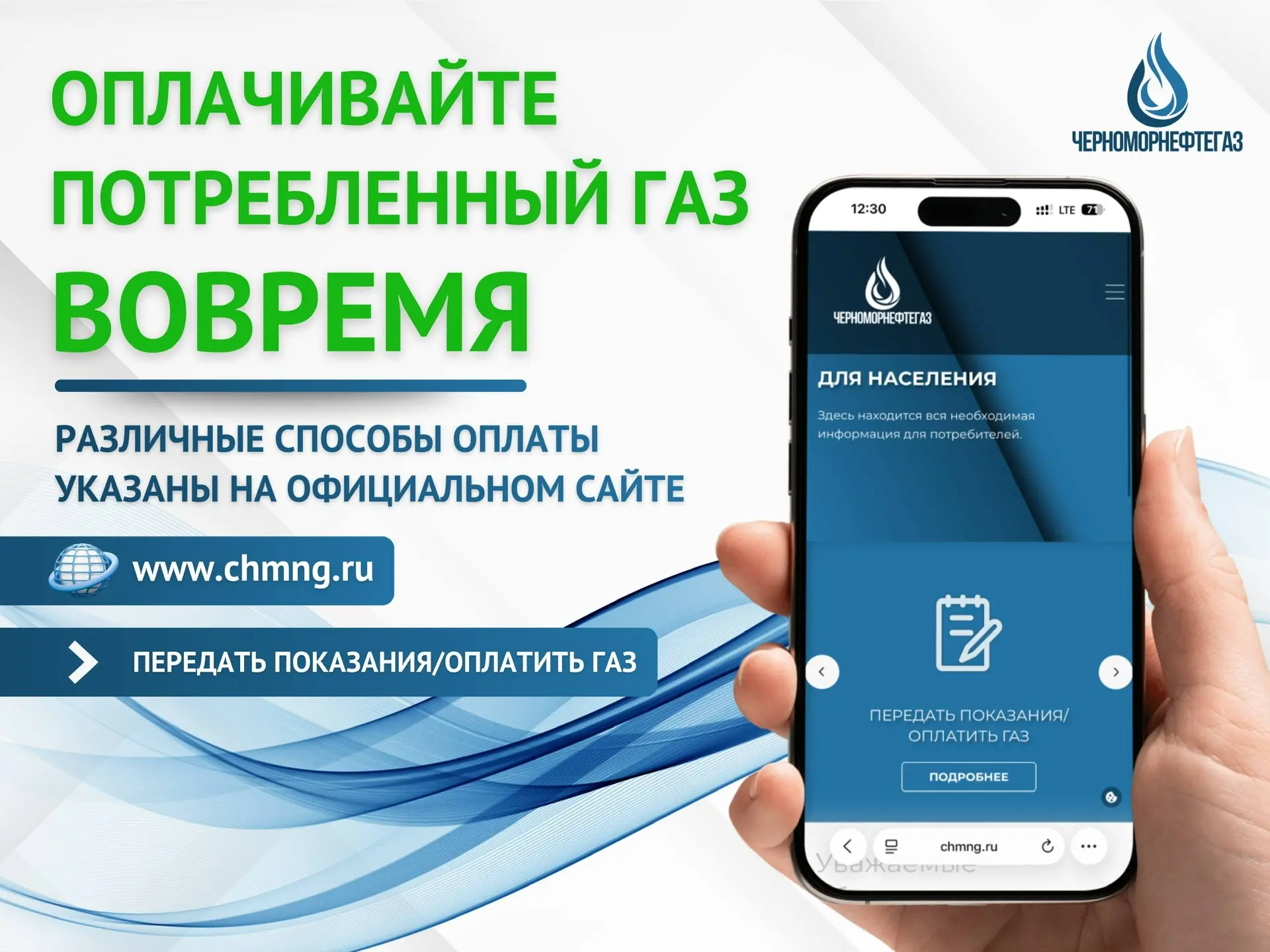 Уважаемые абоненты, ООО «Черноморнефтегаз» напоминает о возможности передачи показаний приборов учёта газа через онлайн-сервис «Показания».