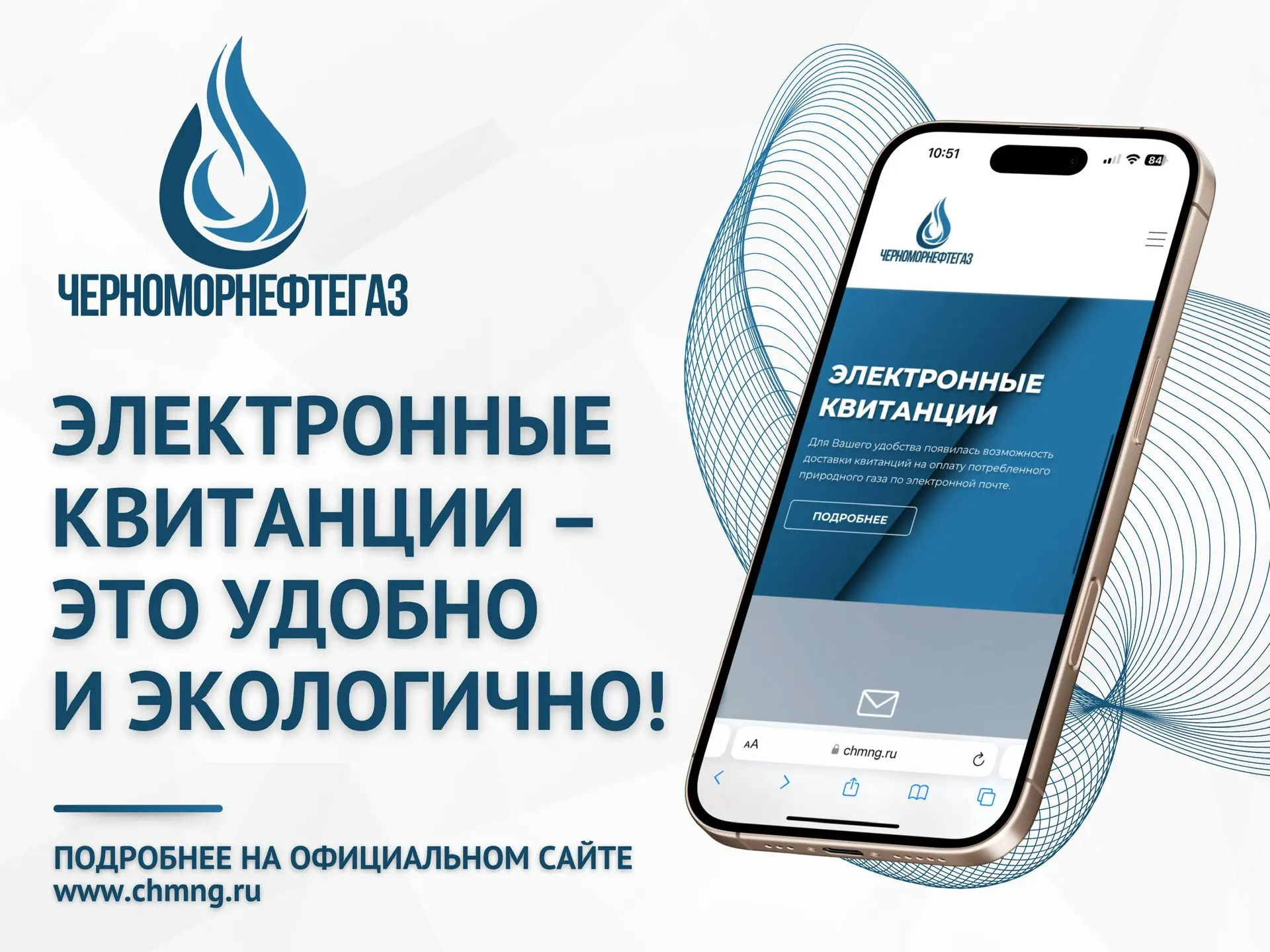 Подключить электронную квитанцию можно в «Личном кабинете потребителя», который доступен для всех филиалов ООО «Черноморнефтегаз» по ссылке: https://www.chmng.ru/consumer/lk