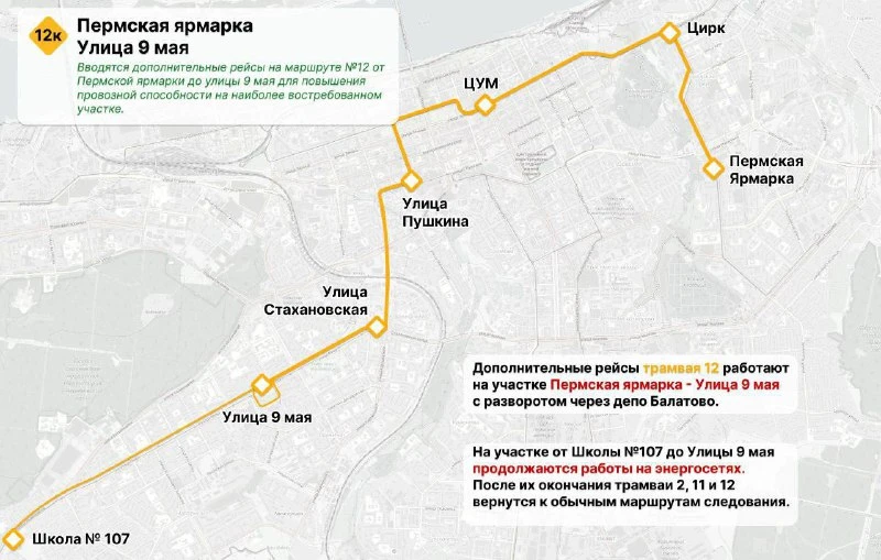 На трамвайном маршруте № 12 вводятся дополнительные укороченные рейсы от «Пермской ярмарки» до улицы 9 Мая.