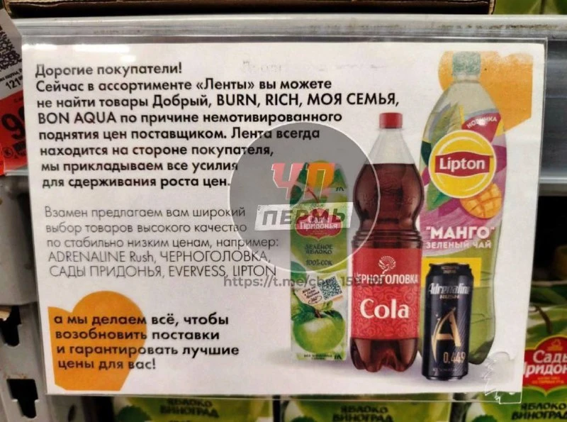 🧃 Напитки «Rich», «Burn», «BonAqua», «Добрый» и «Моя Семья» пропали из прилавков супермаркетов «Лента» из-за заоблачных закупочных цен на продукцию 🛒