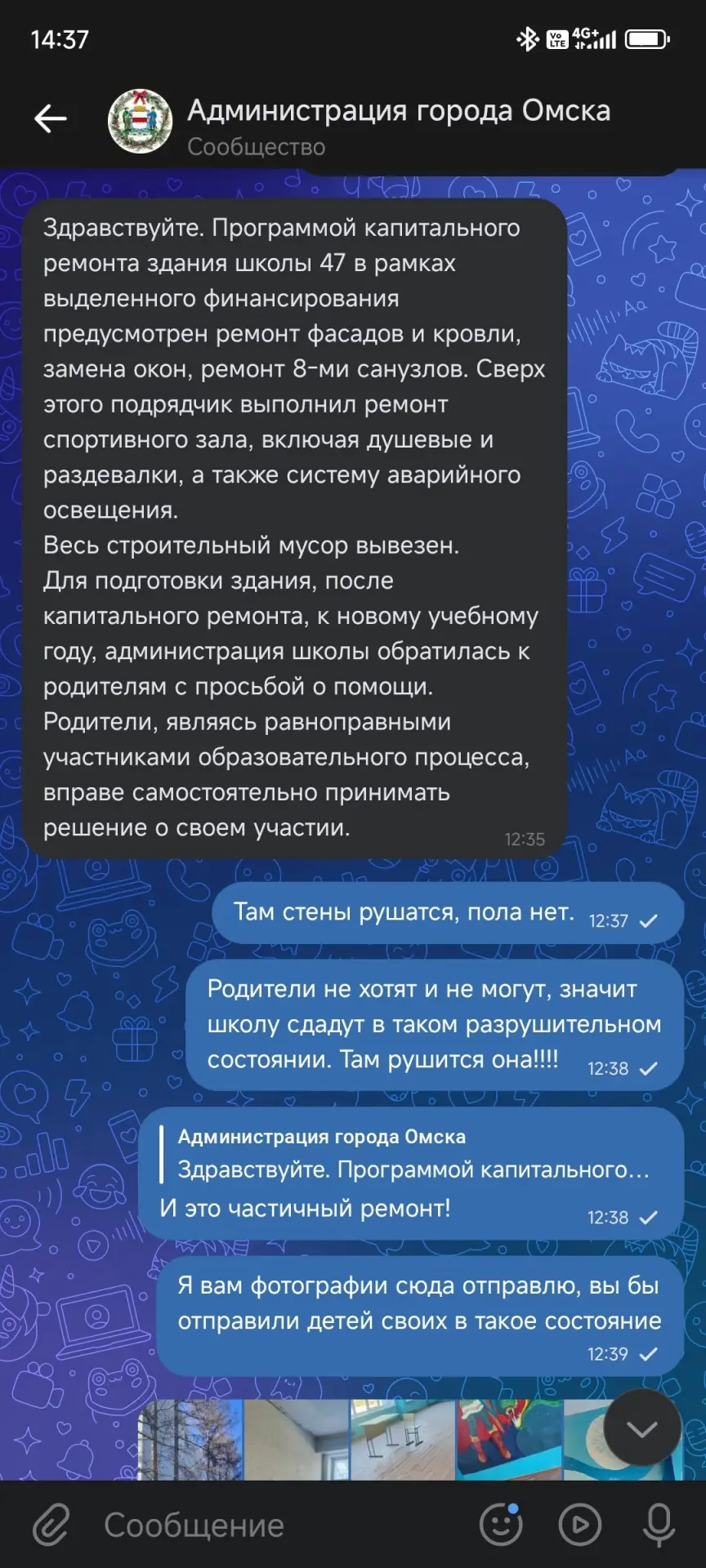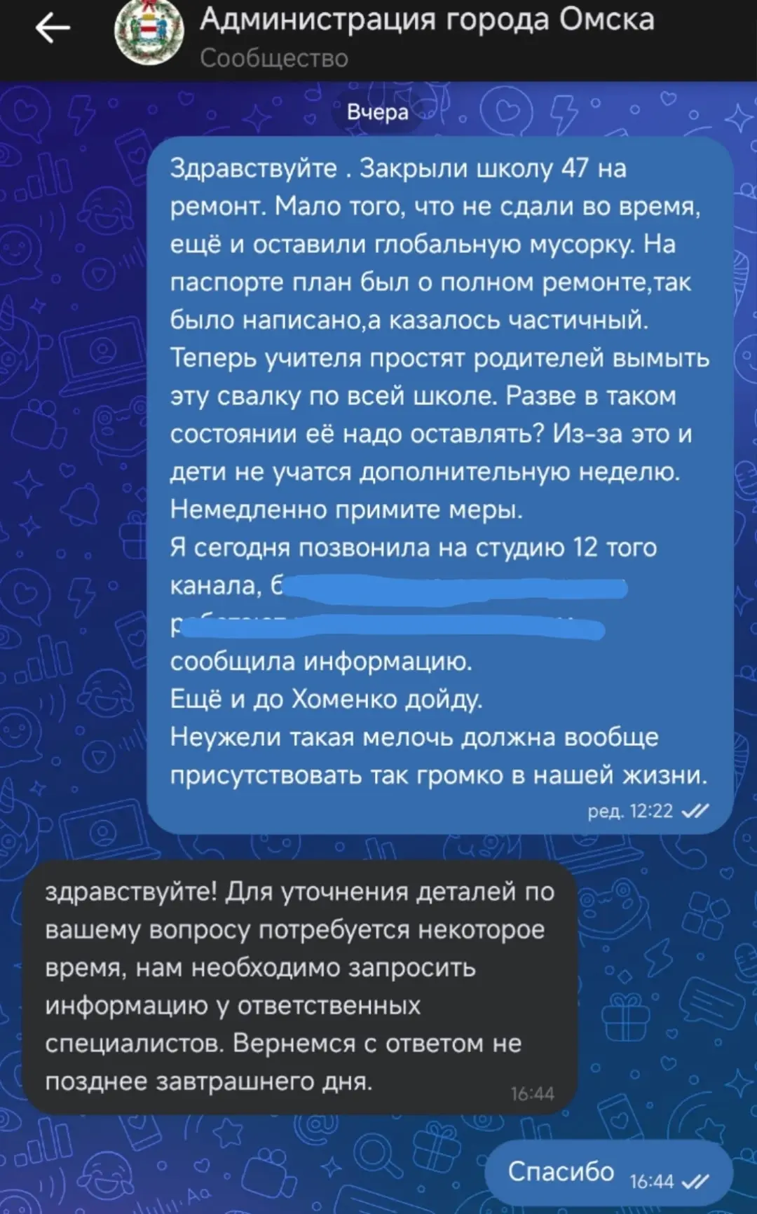 Здравствуйте! Прошу опубликовать! Закрыли школу №47 в КАО на капитальный ремонт. Школу отремонтировали недобросовестно и оставили в убогом состоянии внутри. Администрация города не предупредила всех родителей учащихся детей о том, что мы своими силами должны будем приводить школу в порядок, не выделив даже инвентарь для уборки и мытья. Мало того, со стен сыпется штукатурка, дыры и щели в стенах. Строительная пыль толстым слоем. Учителя вынуждены просить родителей о сборах средств на клининг уборку столовой. В паспорте объекта было четко прописан капитальный ремонт, по факту частичный. Прошу обратить внимание руководителей региона! Прошу помощи от неравнодушных! Администрация отписалась и агитирует родителей на добровольную помощь за неделю с 12.01.2026 по 18.01.2026 вымыть и подремонтировать школу, чтобы 19.01.2026 года дети вышли на занятия. Если родители не помогут, школа откроет свои двери как есть в пыли и разрухе.