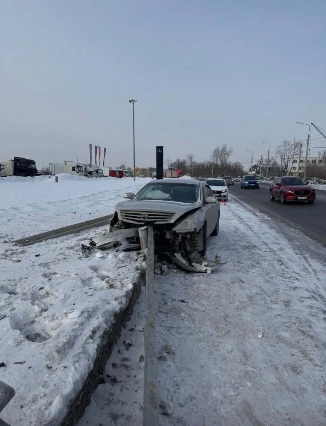Утром на улице 22 Декабря в Омске произошло ДТП с участием иномарки: женщина‑водитель (1982 года рождения) за рулём автомобиля «Ниссан» не справилась с управлением и врезалась в ограждение.