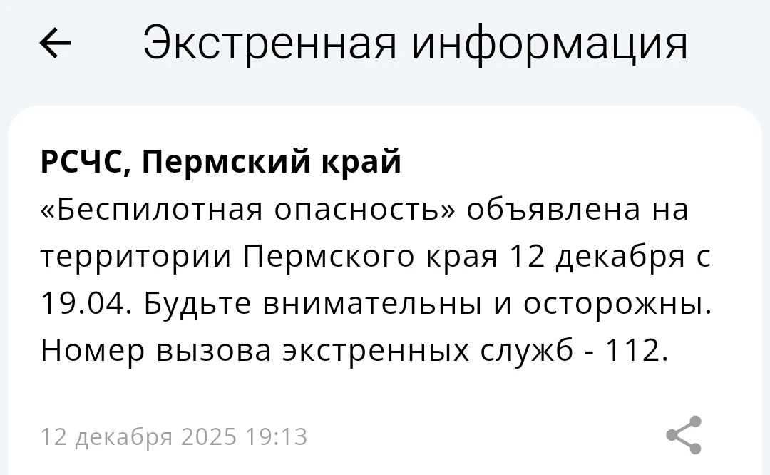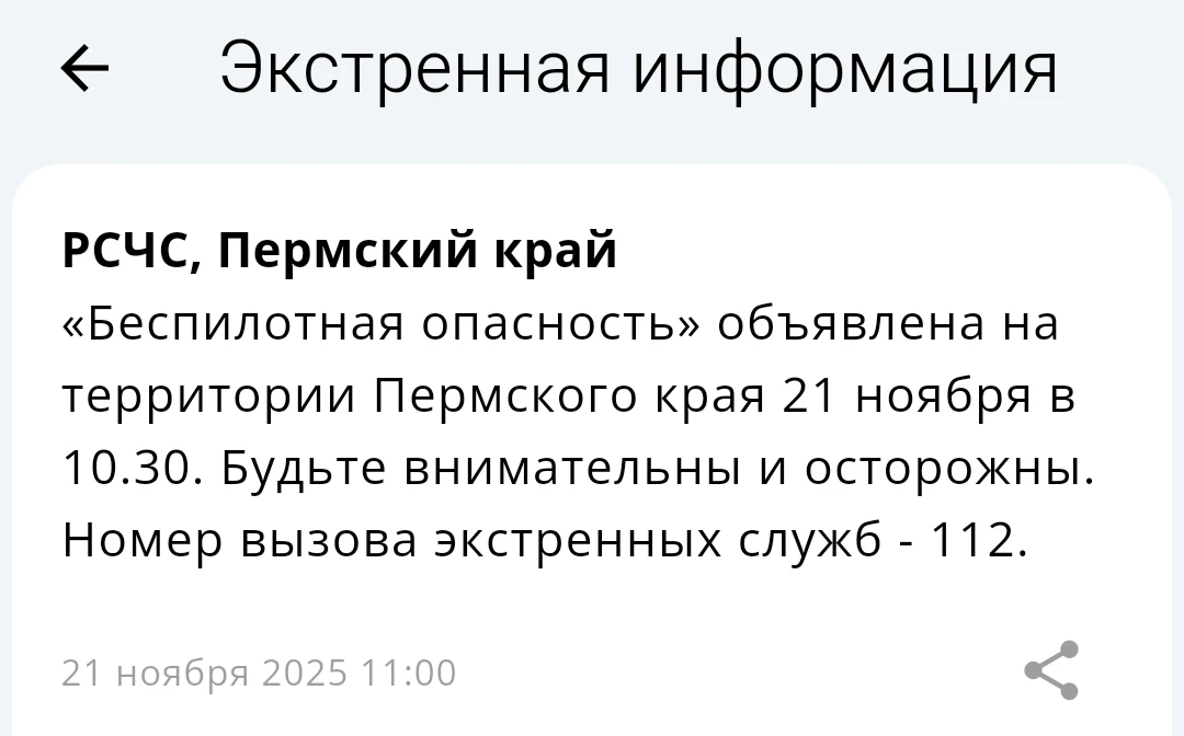 🔴 Беспилотная опасность объявлена на территории Пермского края