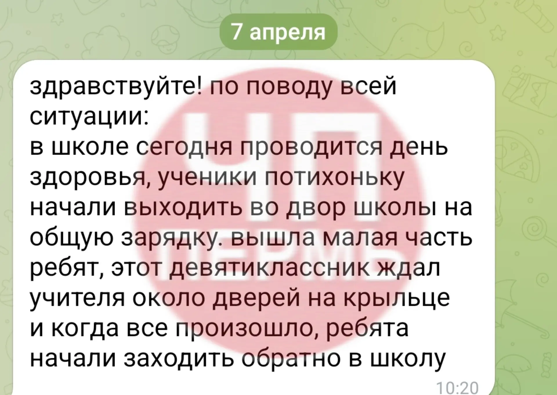 Девятиклассник ударил женщину, когда она вышла на крыльцо проводить зарядку для 5-9 классов, и убежал. По словам местных, позже нападавший сам пришёл в полицию.
