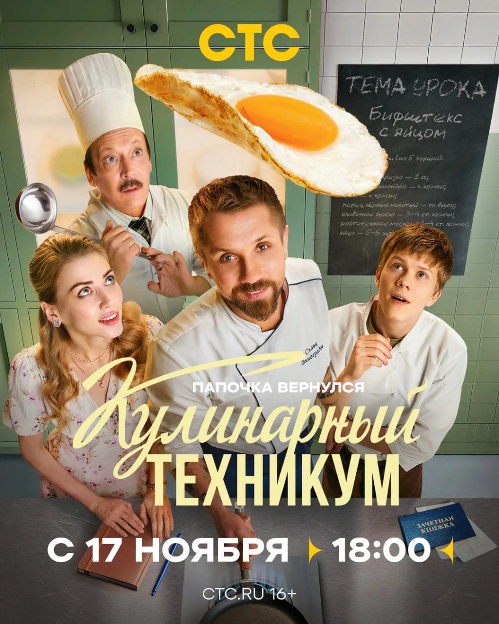 Сегодня на телеканале СТС состоится премьера комедийного сериала «Кулинарный техникум». Первая серия выйдет в эфир в 18:00.
