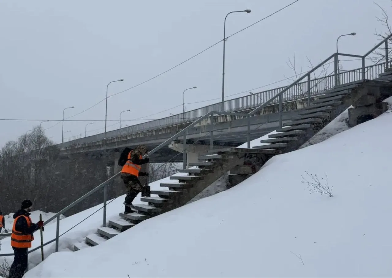 Дорожное покрытие обрабатывают противогололедными материалами. Снегоуборочная техника задействована на расширении проезжей части, рабочие убирают подходы к пешеходным переходам, лестницы, остановки общественного транспорта.