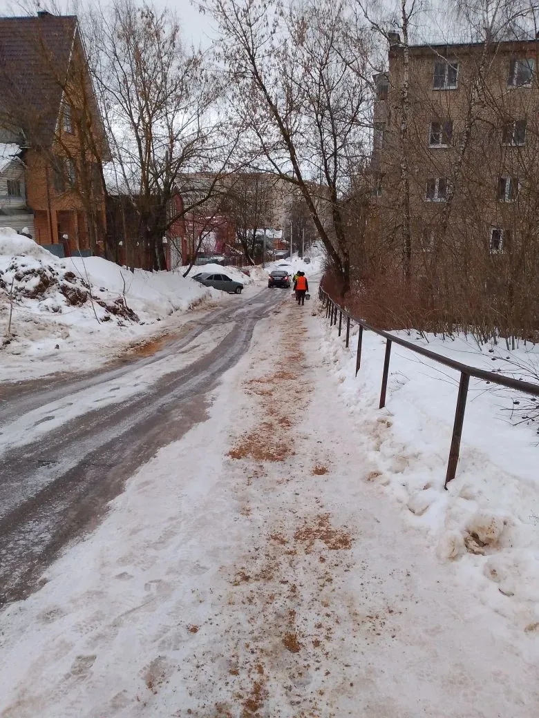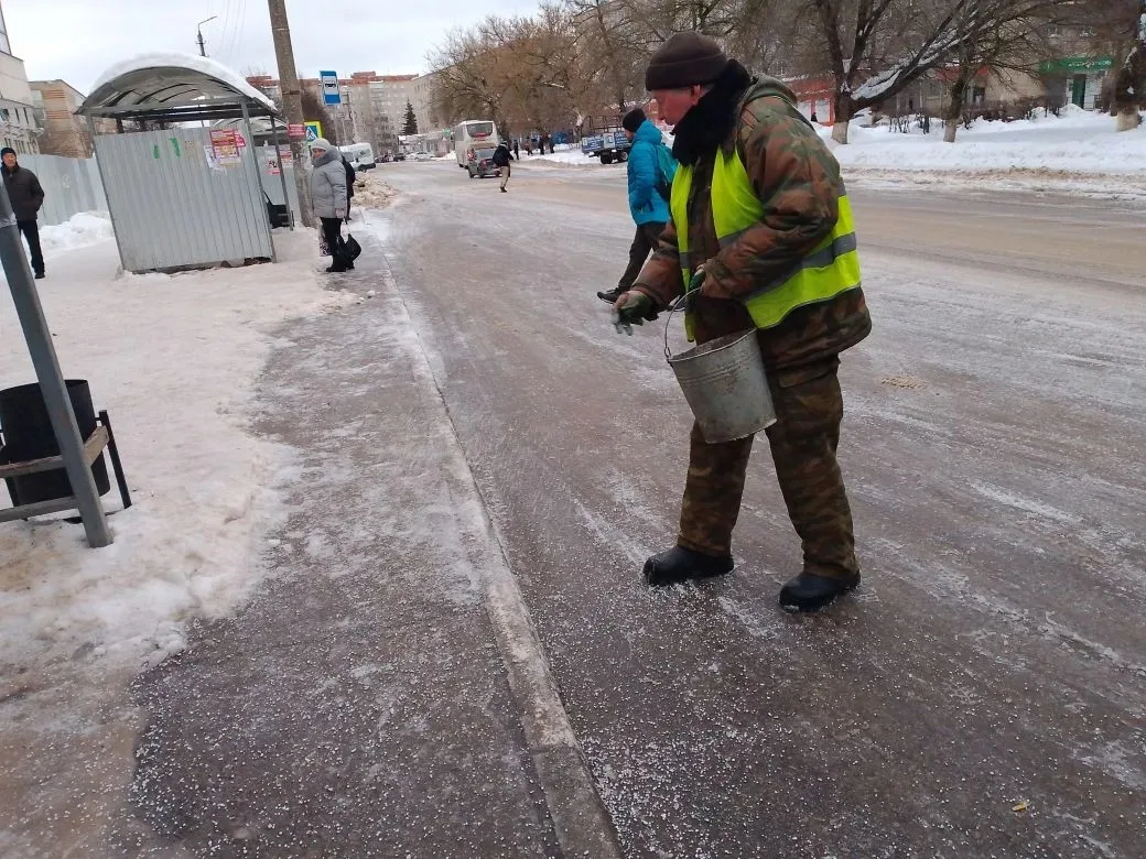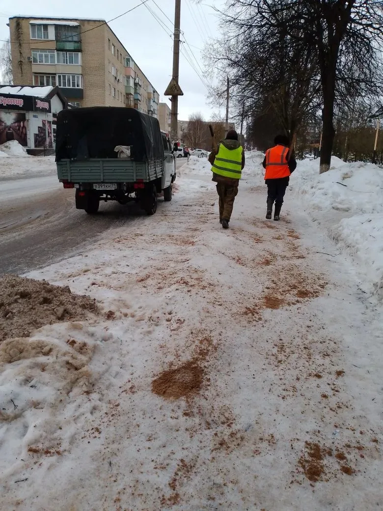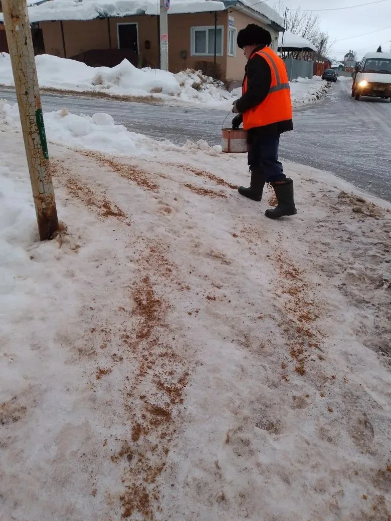 Сотрудники МКУ "Спецавтохозяйство" не жалеют реагентов и песко-соляной смеси для посыпки пешеходных зон в городе.