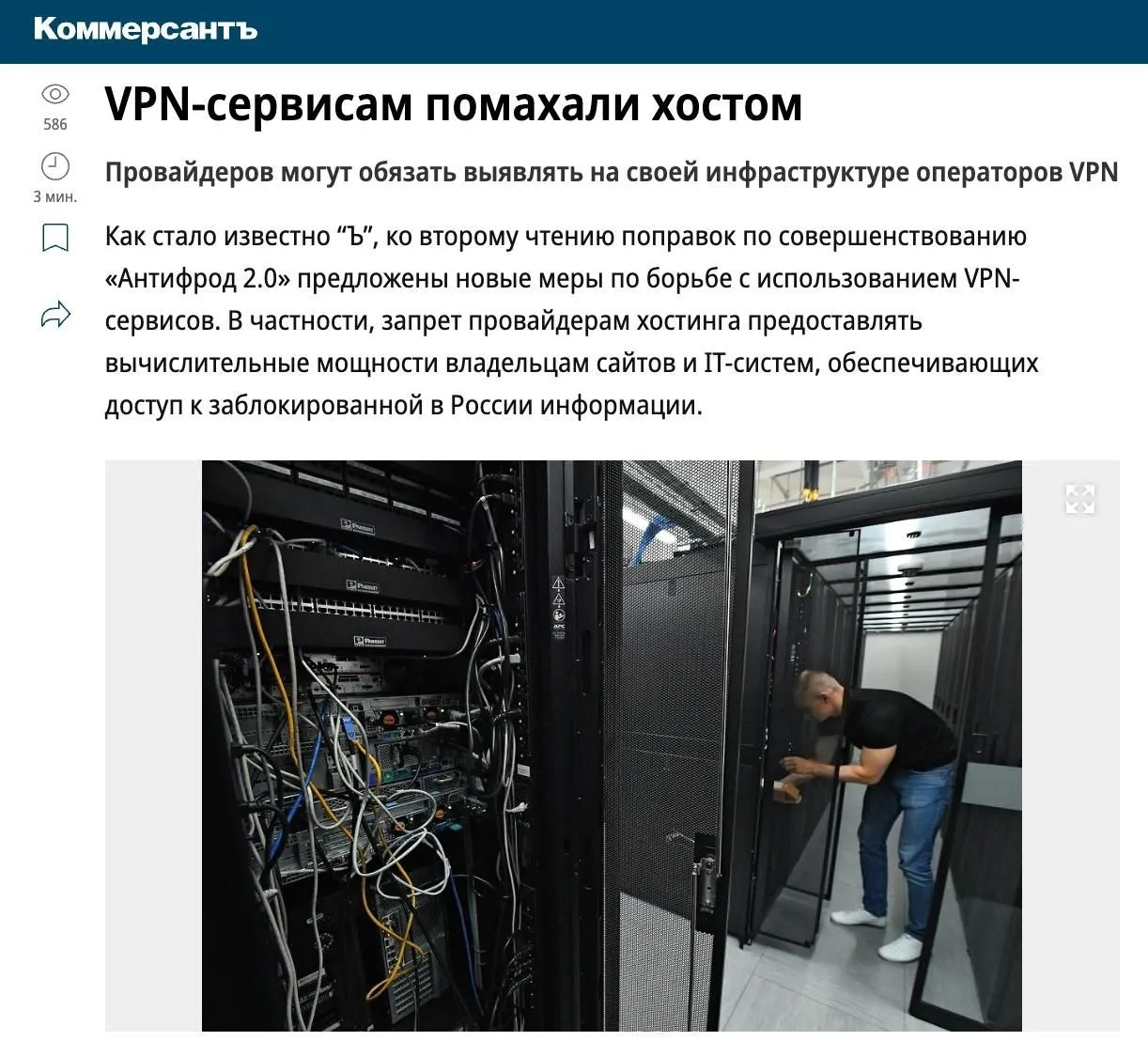 Новый удар по VPN: крупнейшим хостинг-провайдерам могут запретить предоставлять мощности для работы VPN-сервисов — соответствующие поправки в закон «Антифрод 2.0» готовят ко второму чтению.