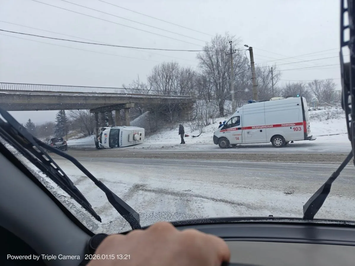 В Енакиево инкассаторский автомобиль занесло на заснеженной дороге. Машина вылетела с проезжей части, врезалась в столб и перевернулась. Сейчас движение перед Веровским кольцом затруднено.