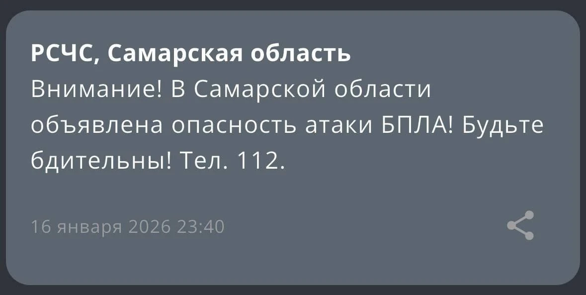 ⚡В Самарской области объявили угрозу атаки БПЛА.