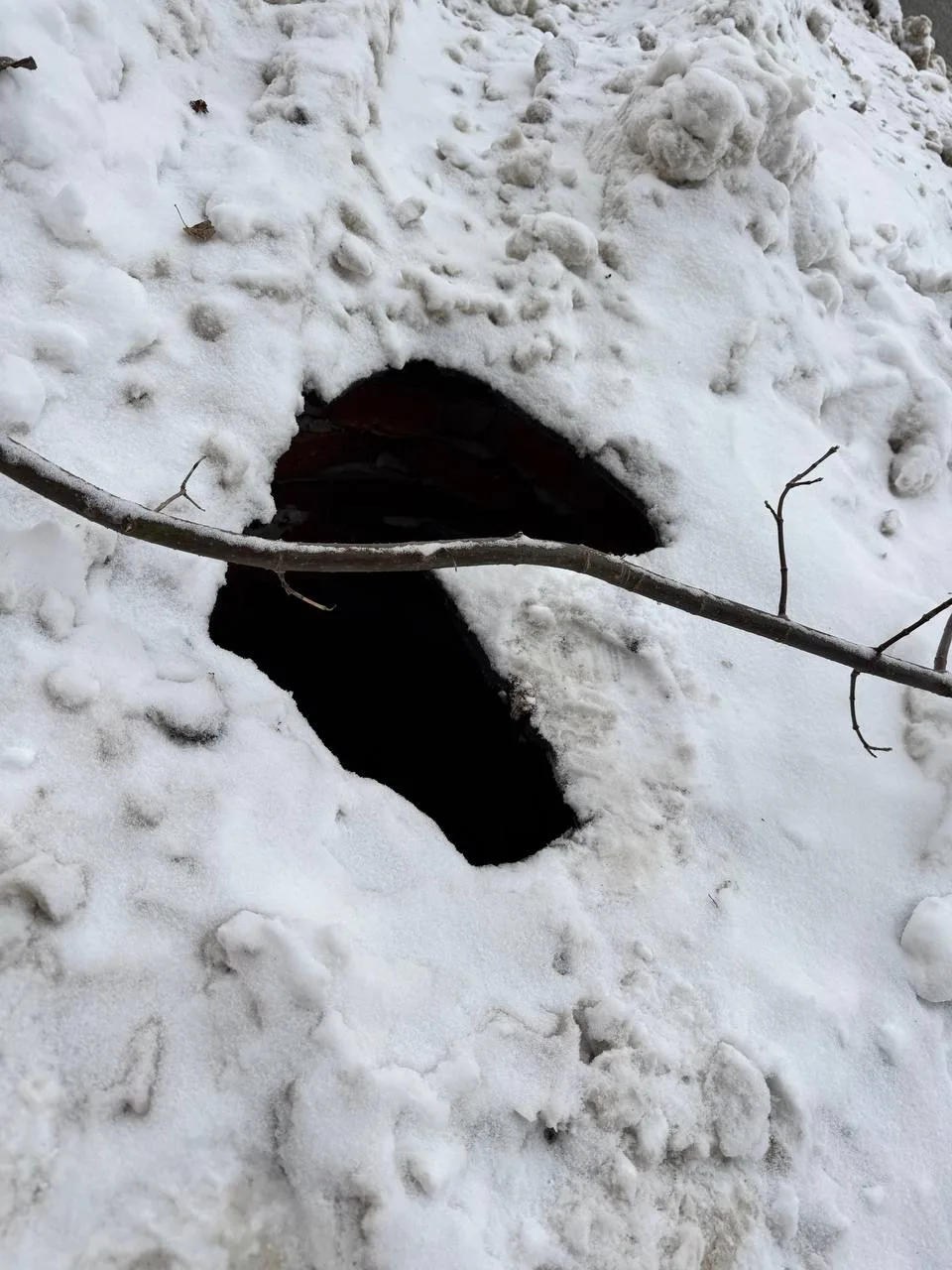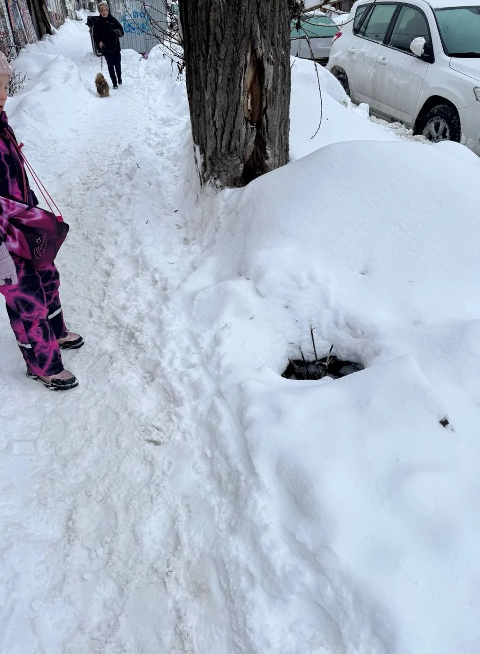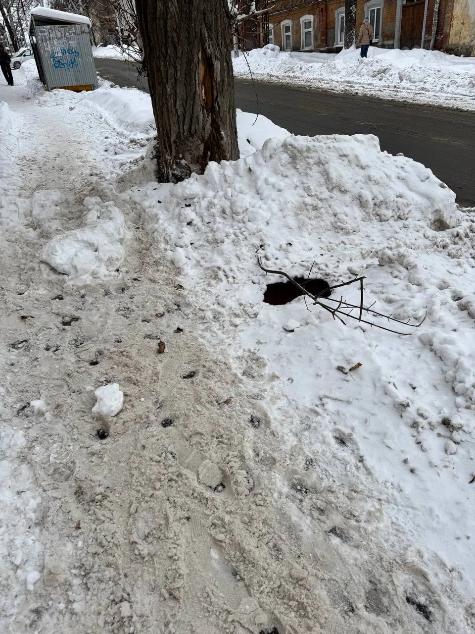 #отподписчицы Хочу показать, как чистят улицы Саратова. Бобкет или что чистит тротуары, не смог проехать в узком месте, и съезжая на дорогу содрал люк. Теперь под снегом открытый колодец глубиной более 2,5 м. Это было ещё 10 января и колодец все еще открыт!И в нее может упасть кто угодно. А по этой улице утром ходят дети в 4 лицей и 8 школу. Открытый колодец по улице Соборная/ Челюскинцев Д. 73