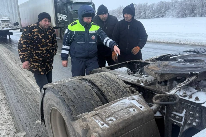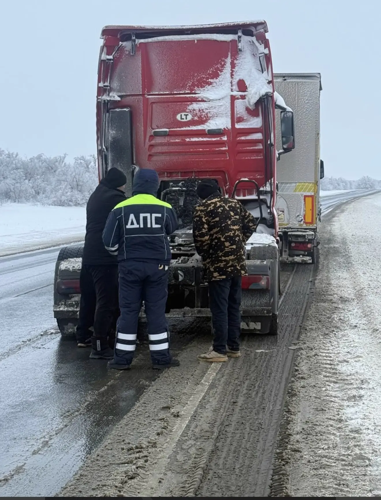 Инспекторы — старший лейтенант Руслан Ряполов и старший лейтенант Ахмад Казеев — помогли доставить большегруз до ближайшего населенного пункта.