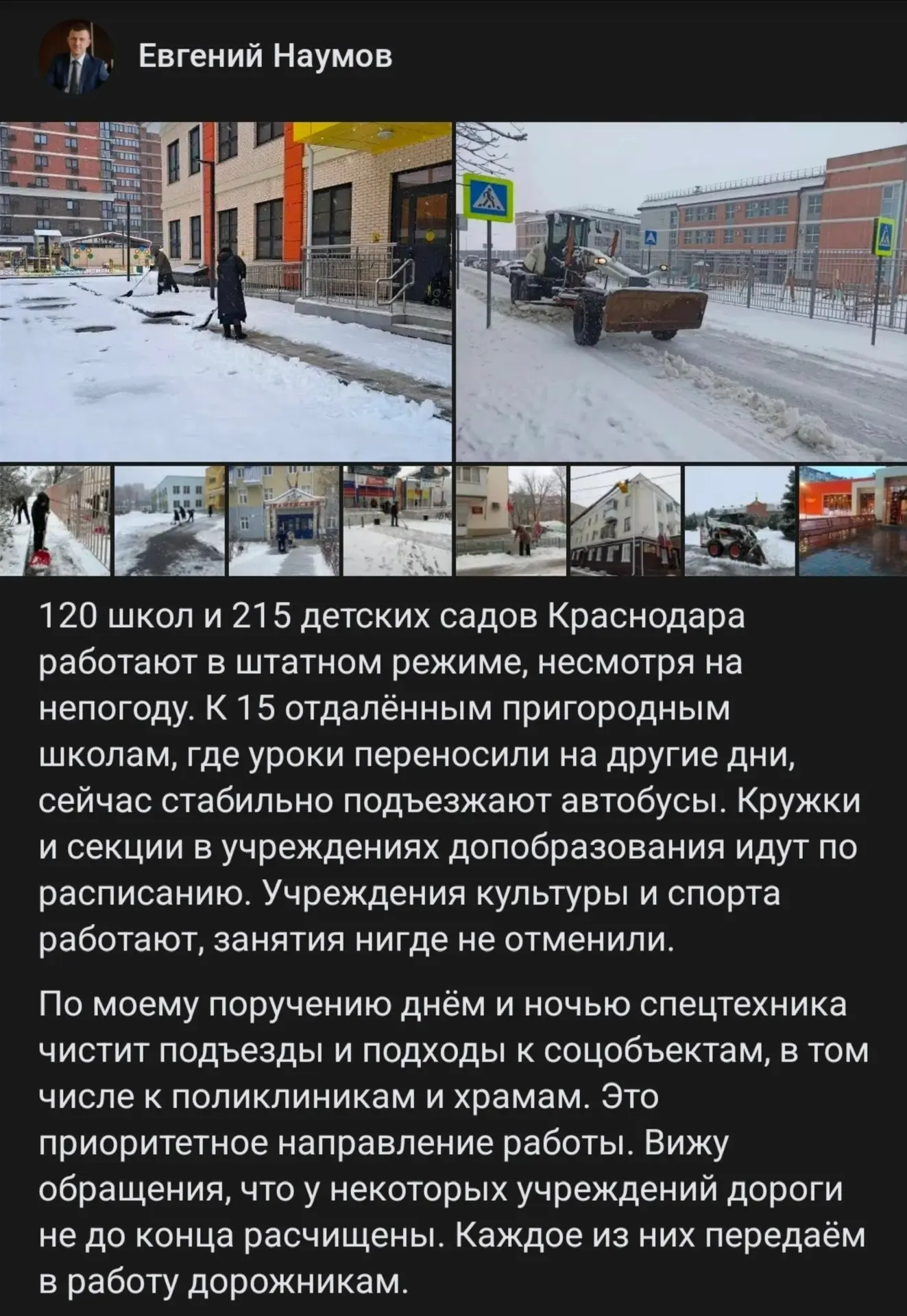 Непогода продолжается, и мы продолжаем круглосуточную очистку и обработку от скользкости городских территорий. Все вместе. Благодарен каждому жителю, кто взял в руки лопату и сам все эти дни расчищает подходы к своей работе.