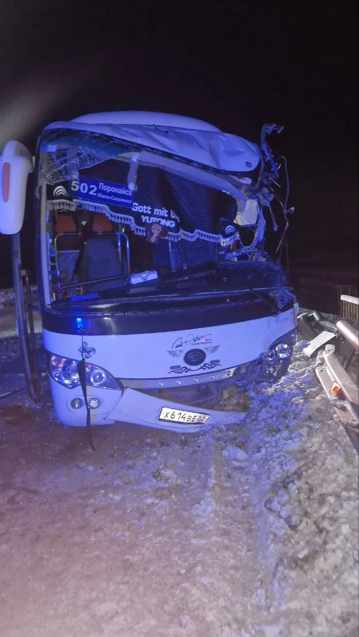 ❗️На трассе «Южно-Сахалинск — Оха» столкнулись пассажирский автобус и погрузчик