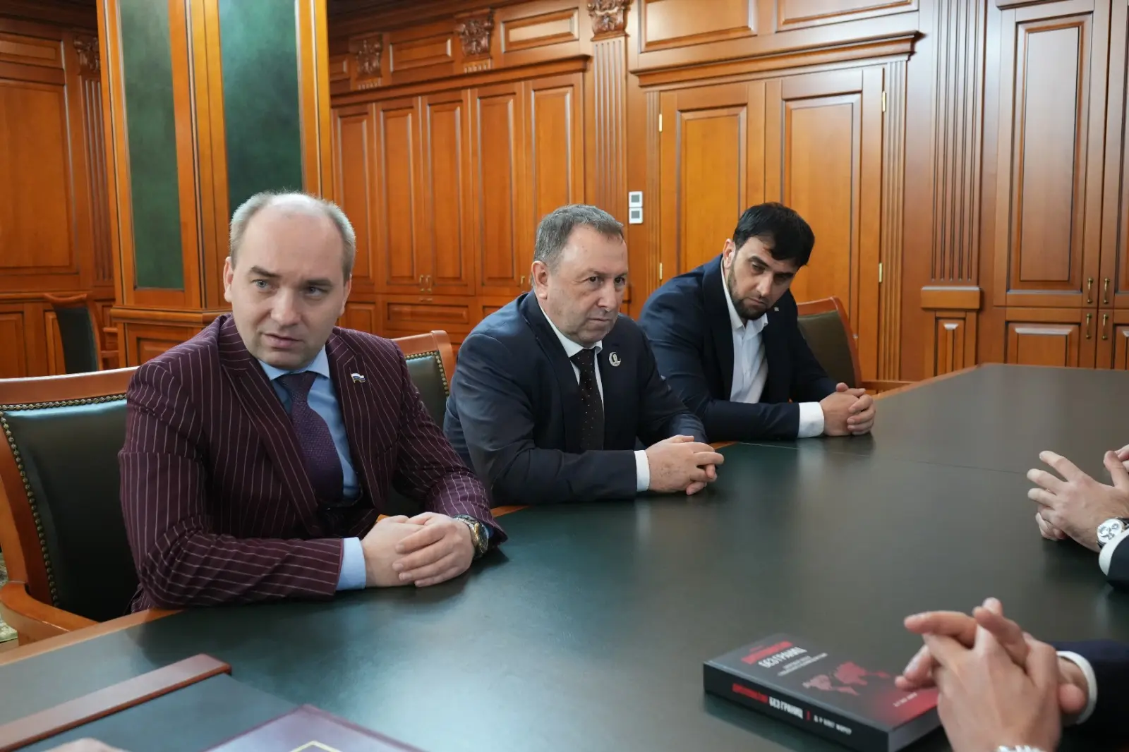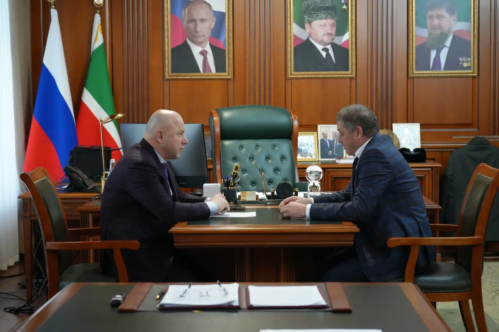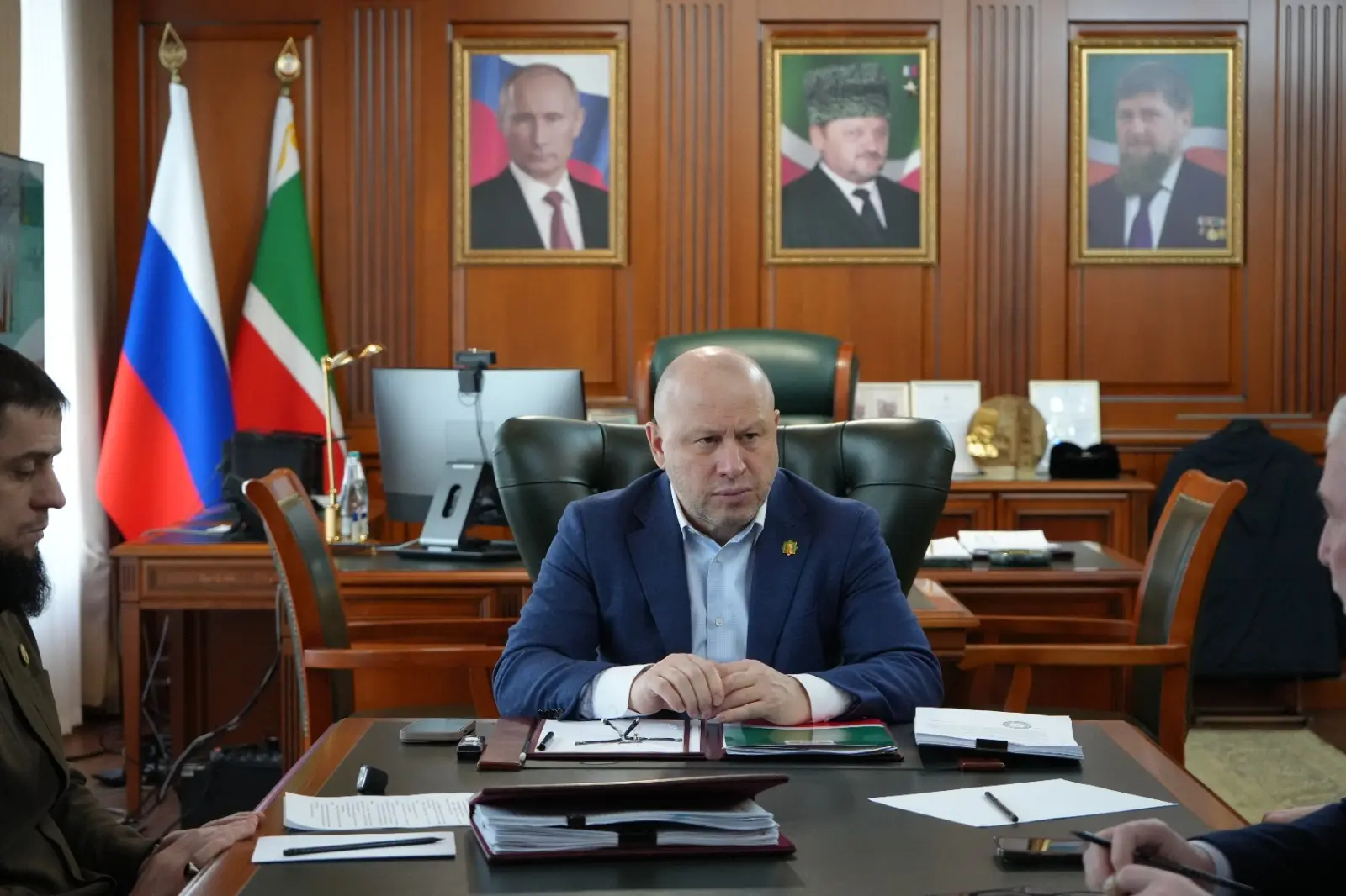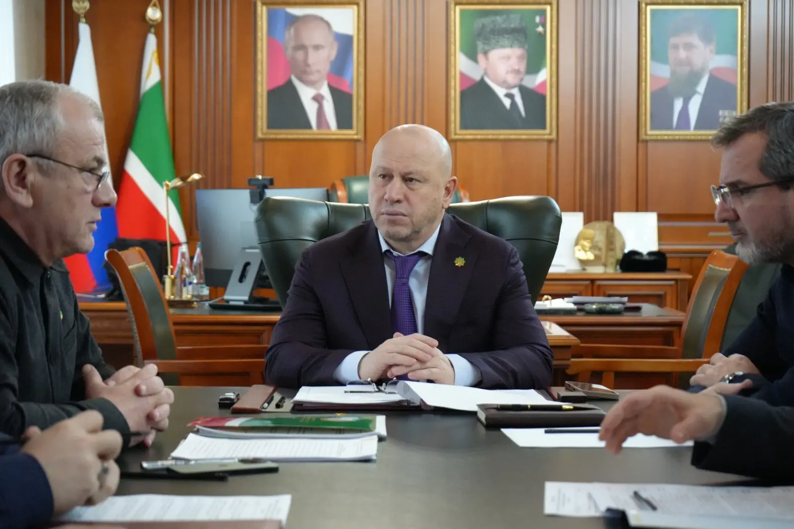 Сегодня Руководитель Администрации Главы и Правительства ЧР Галас Таймасханов провёл рабочую встречу с заместителем полпреда Президента РФ в СКФО, атаманом Всероссийского казачьего общества Виталием Кузнецовым и министром ЧР по национальной политике, внешним связям, печати и информации Ахмедом Дудаевым.