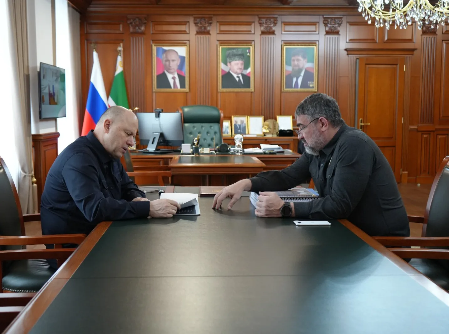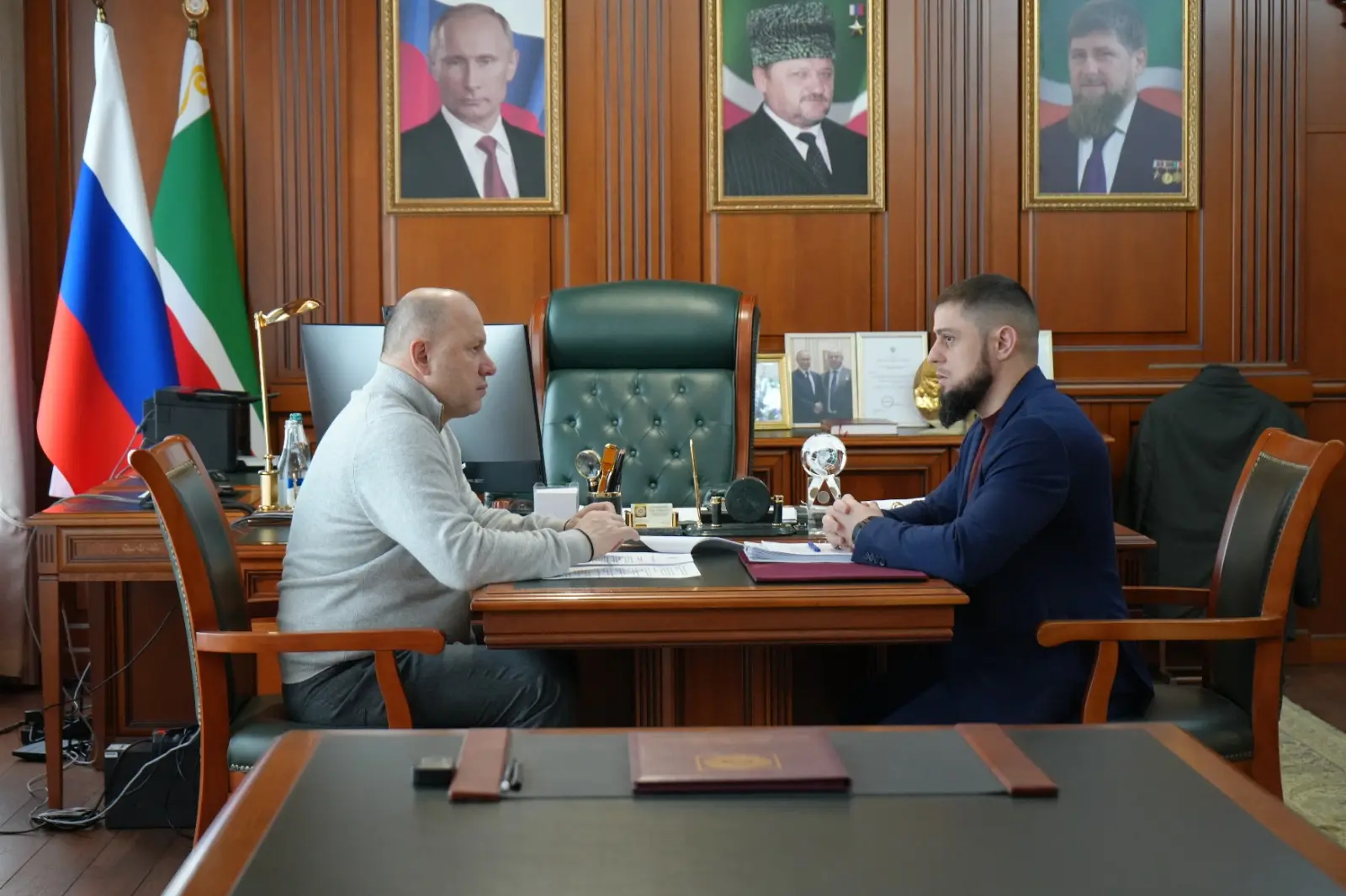 Сегодня Руководитель Администрации Главы и Правительства ЧР Галас Таймасханов провёл рабочую встречу с министром ЧР по национальной политике, внешним связям, печати и информации Ахмедом Дудаевым.