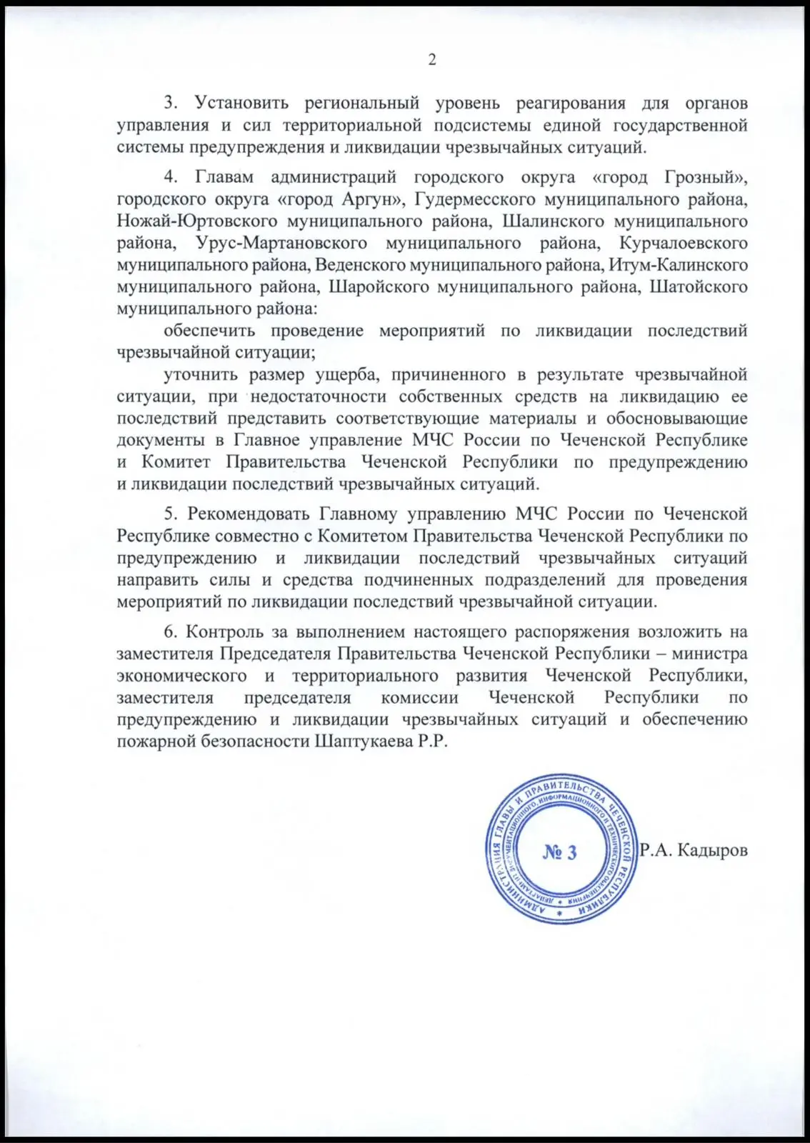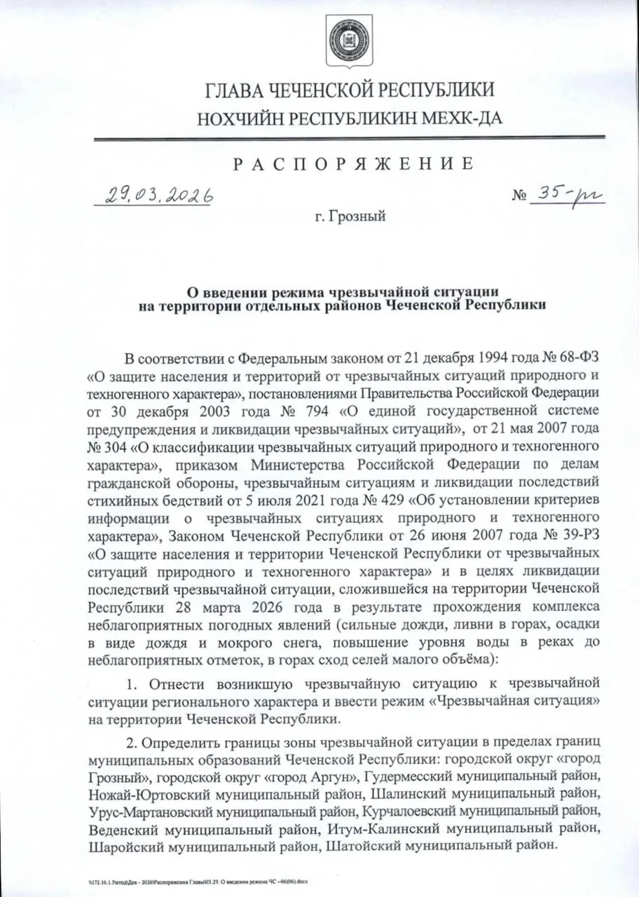 Распоряжением Главы Чеченской Республики Героя России Рамзана Ахматовича Кадырова на территории Республики введён режим чрезвычайной ситуации.