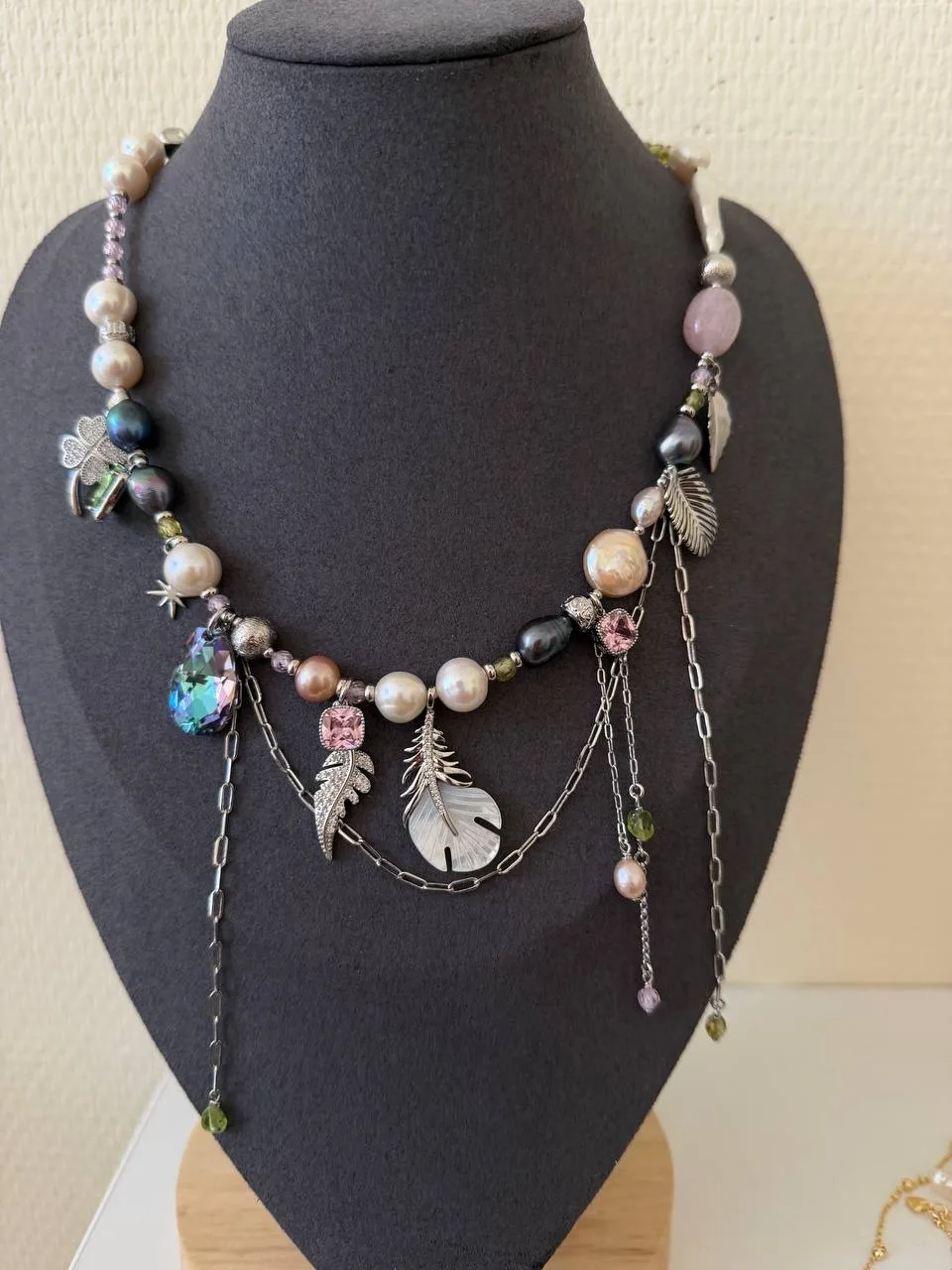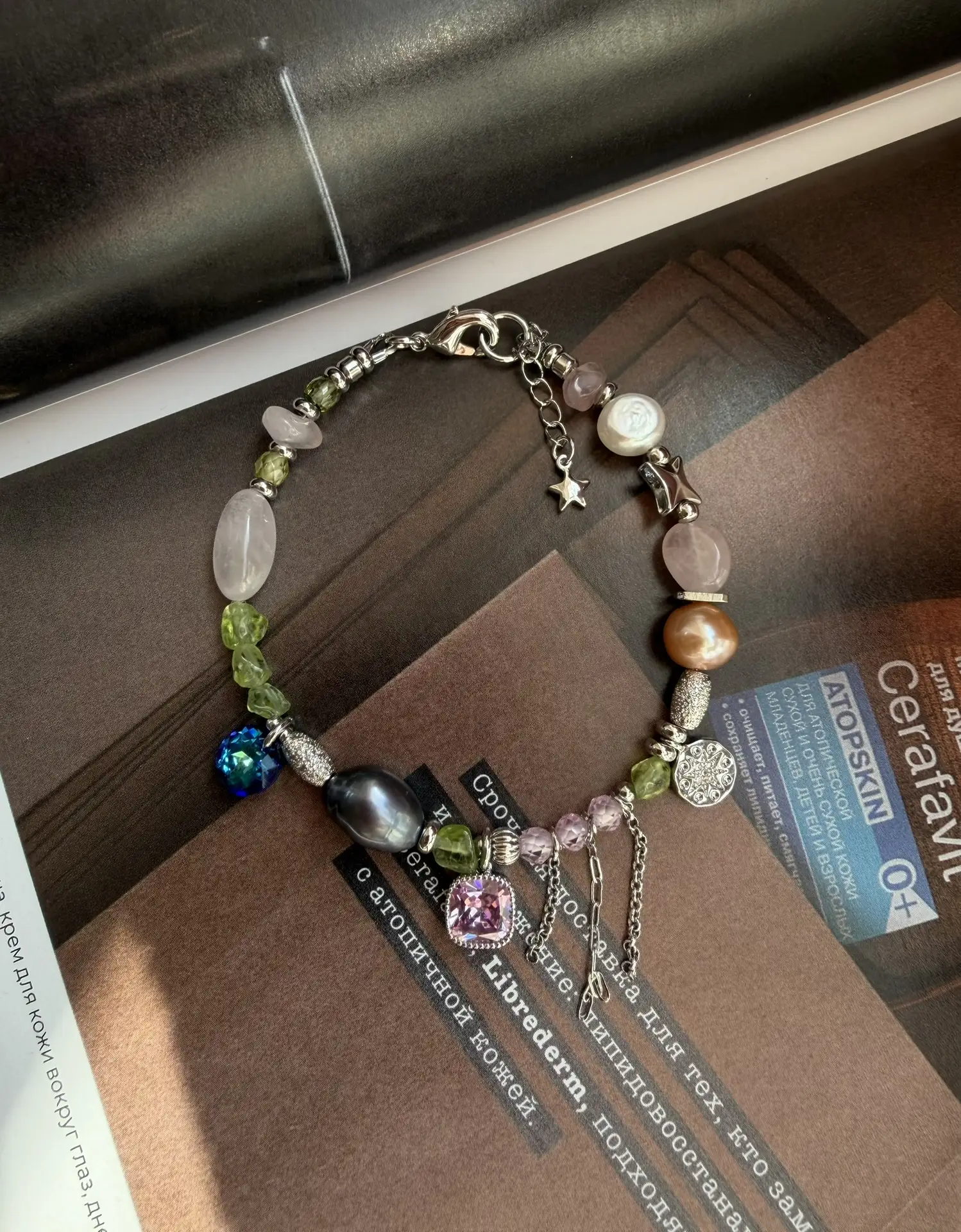 Материалы : натуральный жемчуг, розовый кварц, кристалл, циркон, хризолит