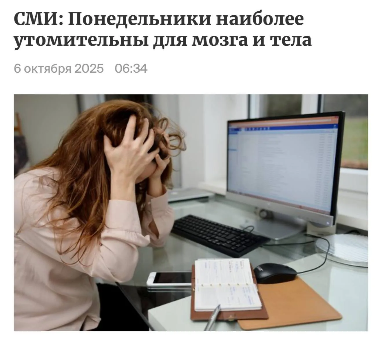 Понедельники убивают — официально доказали учёные. Первый рабочий день недели разрушает здоровье и психику человека. Вероятность сердечных приступов в этот день возрастает на 19%. У людей наблюдается повышенная тревожность, стресс и даже суицидальные мысли. Всё это связано с тем, что новая неделя начинается с неопределённости и давления предстоящих дел.