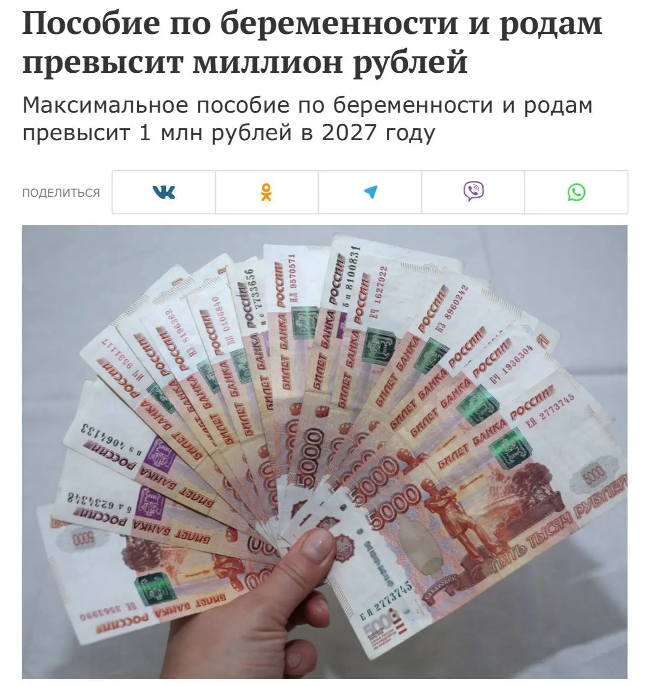До 1 миллиона рублей увеличат пособие по беременности и родам для россиянок к 2027 году. Об этом сообщили в Социальном фонде России. В 2026 году сумма составит 955 836 рублей, а максимальная месячная выплата достигнет 207 500 рублей. К 2028 году этот показатель вырастет до 258 000 рублей. Также повысится ежемесячное пособие по уходу за ребёнком до полутора лет — до 83 000 рублей в 2026 году и до 103 200 рублей в 2028-м. При этом размер выплат будет индивидуальным и зависеть от дохода и уплаченных страховых взносов за предыдущие годы.